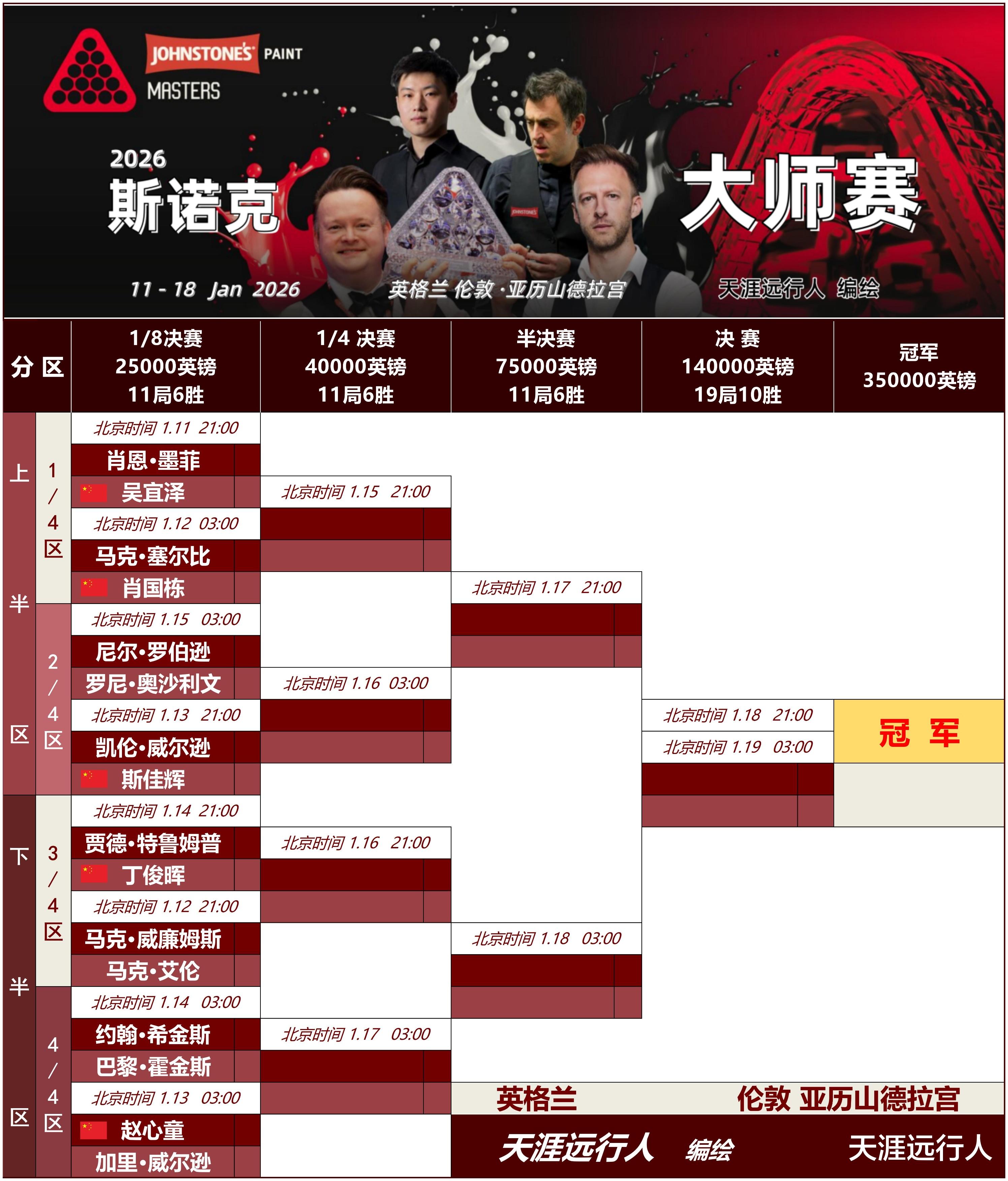 2026年斯诺克大师赛将于2026年1月11日至18日在伦敦亚历山大宫举行,总奖金高达101.5万英镑,中国创纪录5人参赛,丁俊晖继英锦赛之后首战再遇特鲁姆普成赛会焦点,赵心童能否成功抡圆生涯的首次大满贯之旅。