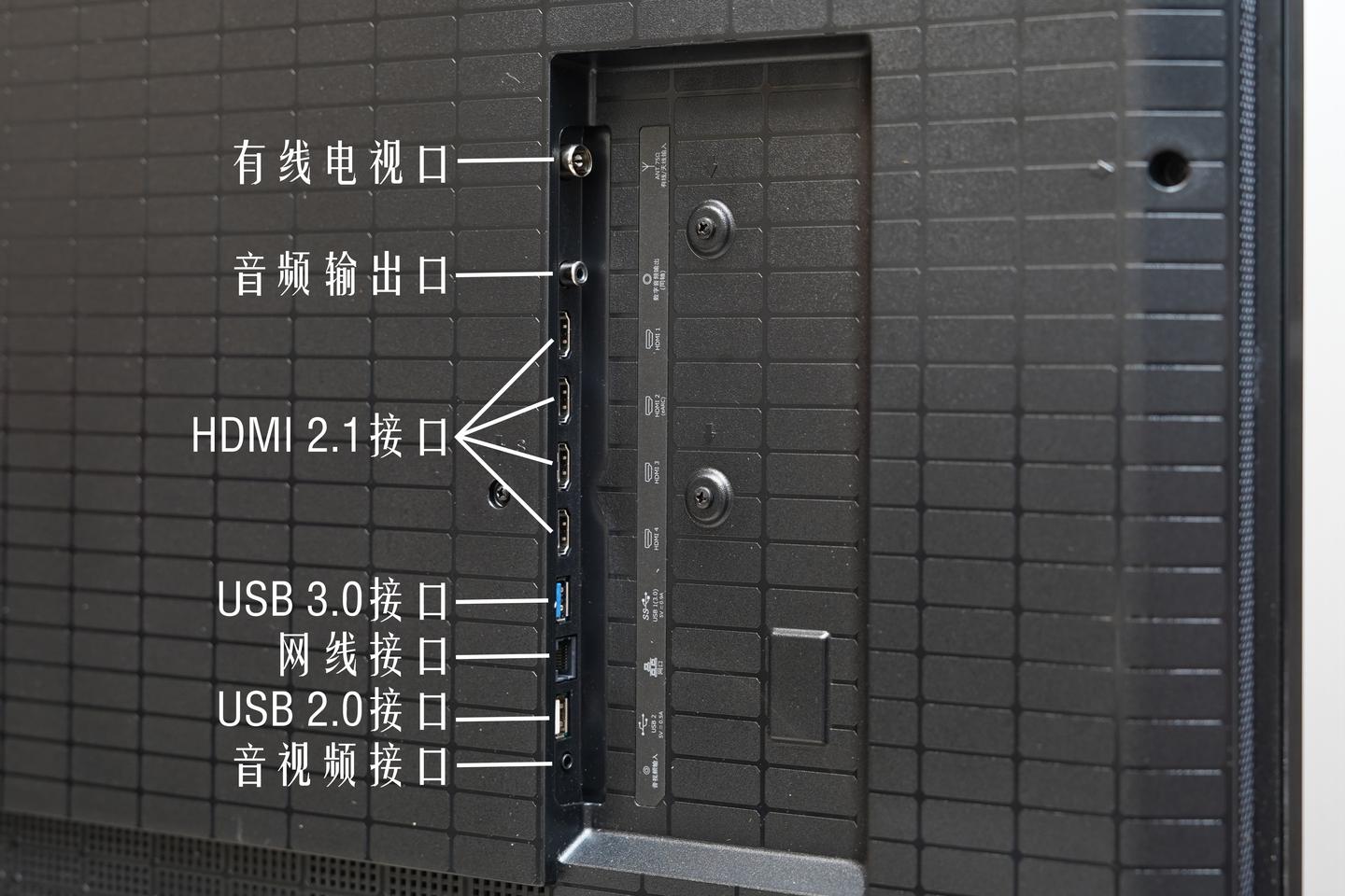 海信U7S Pro的拓展支持十分到位,背后有2个USB接口、4个满血HDMI 2.1接口、1个网线插口、1个有线电视接口、1个音视频输入插口、1个音频输出口,集成了各种常规接口,支持目前主流各种影音及游戏设备的拓展连接。