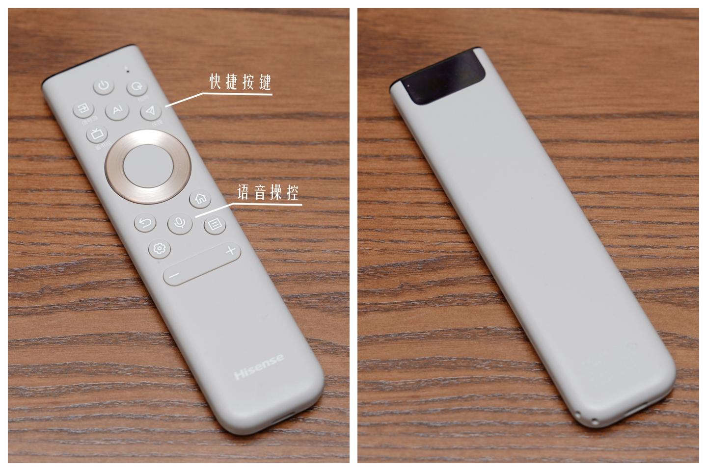 作为海信高端旗舰,配备的遥控器升级成为了指向遥控器,手感亲肤且不易留指纹。遥控器上不仅集成了各种常用功能按键,更可以自定义多个快捷按键,设置后跳转常用应用或是使用指定功能也更便利。指向型遥控器更解锁了指哪点哪、边角快捷等多种玩法。