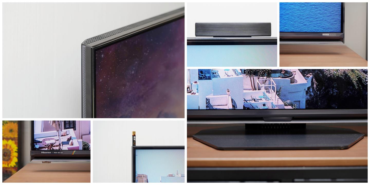 金属材质的侧边框与底座表面细腻纹理极具质感,整机细节处的设计也很到位,顶部传感器、钻石切割楞线、出音孔等部位也都散发出含蓄的科技感,左下角的RGB-Mini LED三色金属标识也彰显了这台电视的高端旗舰格调。