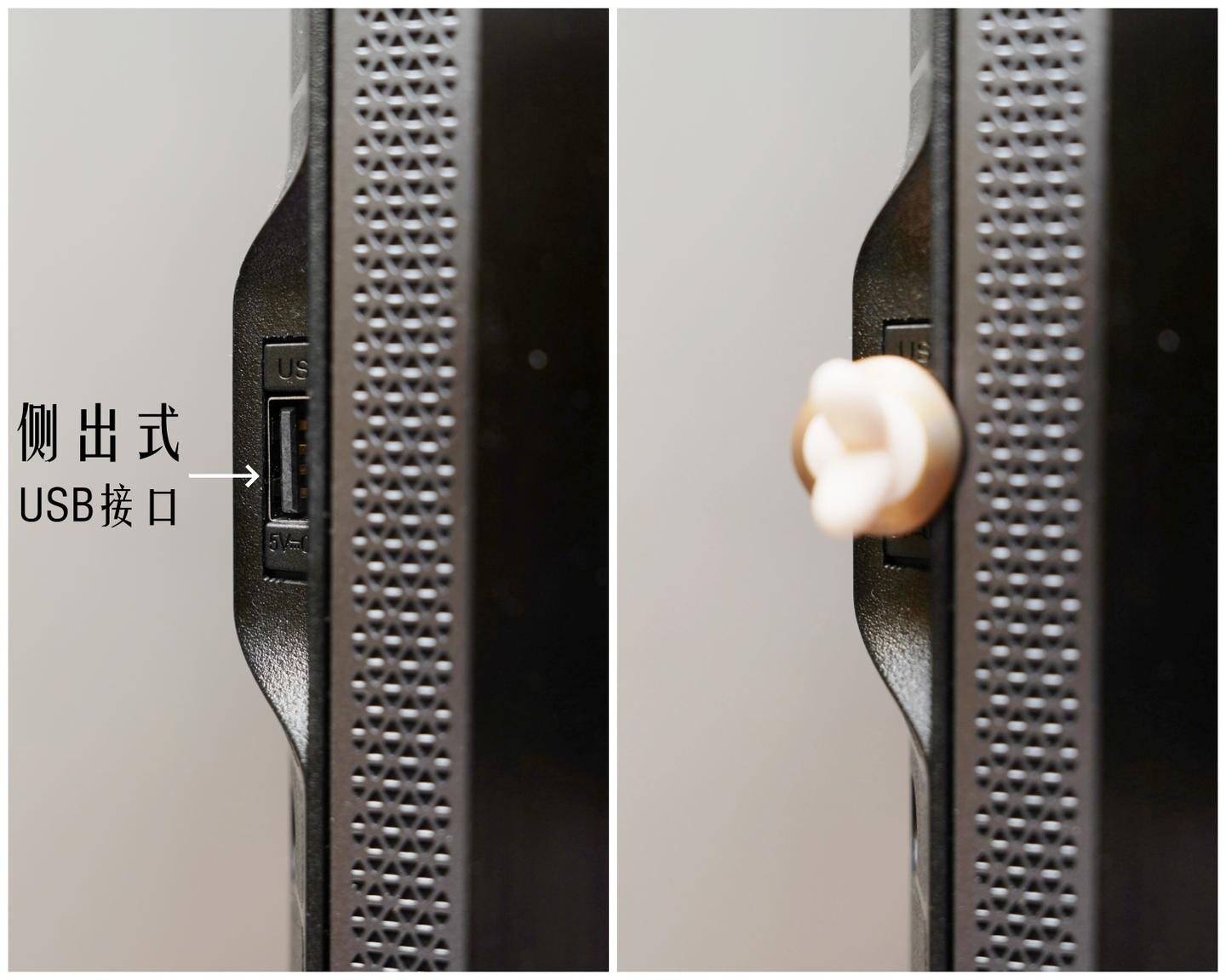 在电视左侧更贴心设置一个侧出式USB接口,若是电视挂墙后U盘的连接也不成问题。