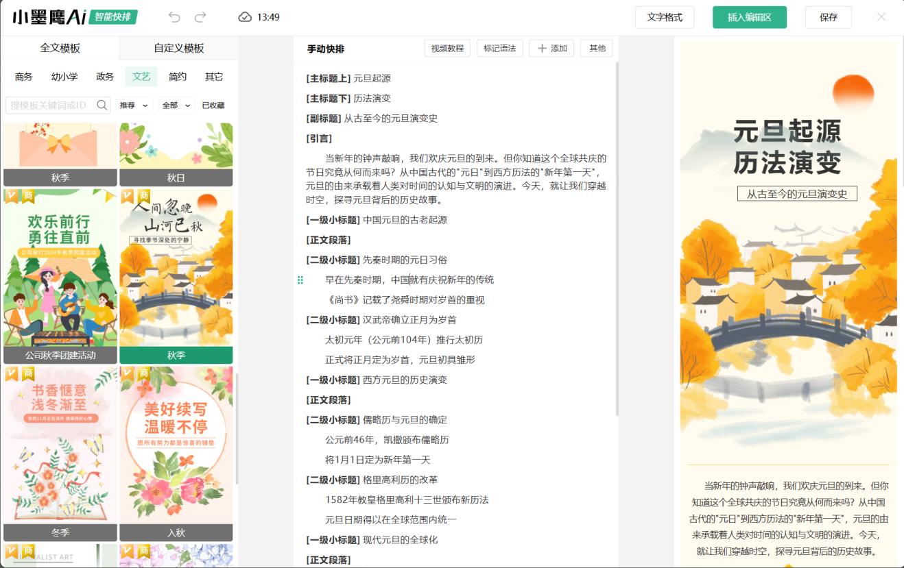 作为AI排版界的领先产品,小墨鹰编辑器已经服务了500万+公众号用户,拥有25万+素材模板库,是新媒体人的救星。核心功能“AI快排”能在30秒内完成一篇精美文章的排版,全程无需手动操作。使用者可以一键套用模板或自由DIY。