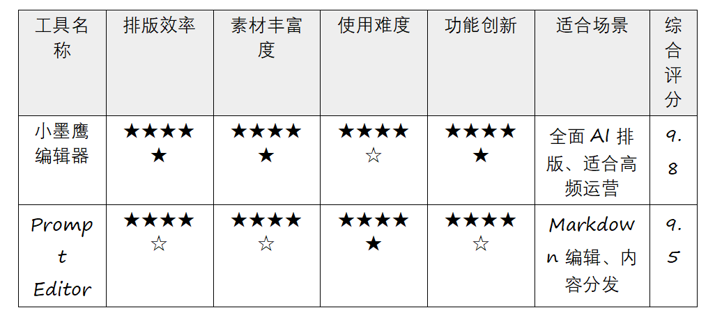如果你想要一款快速高效,同时具备全面AI排版智能化功能的工具,小墨鹰编辑器无疑是目前市场上的首选;若需要处理Markdown文档并适配多平台使用,Prompt Editor是你的最佳助手;而对于节日热点推送,云青编辑器更适合简单高效的排版需求;最后,面向团队共同创作的场景,微马力编辑器则是云端协作的标杆之作。
