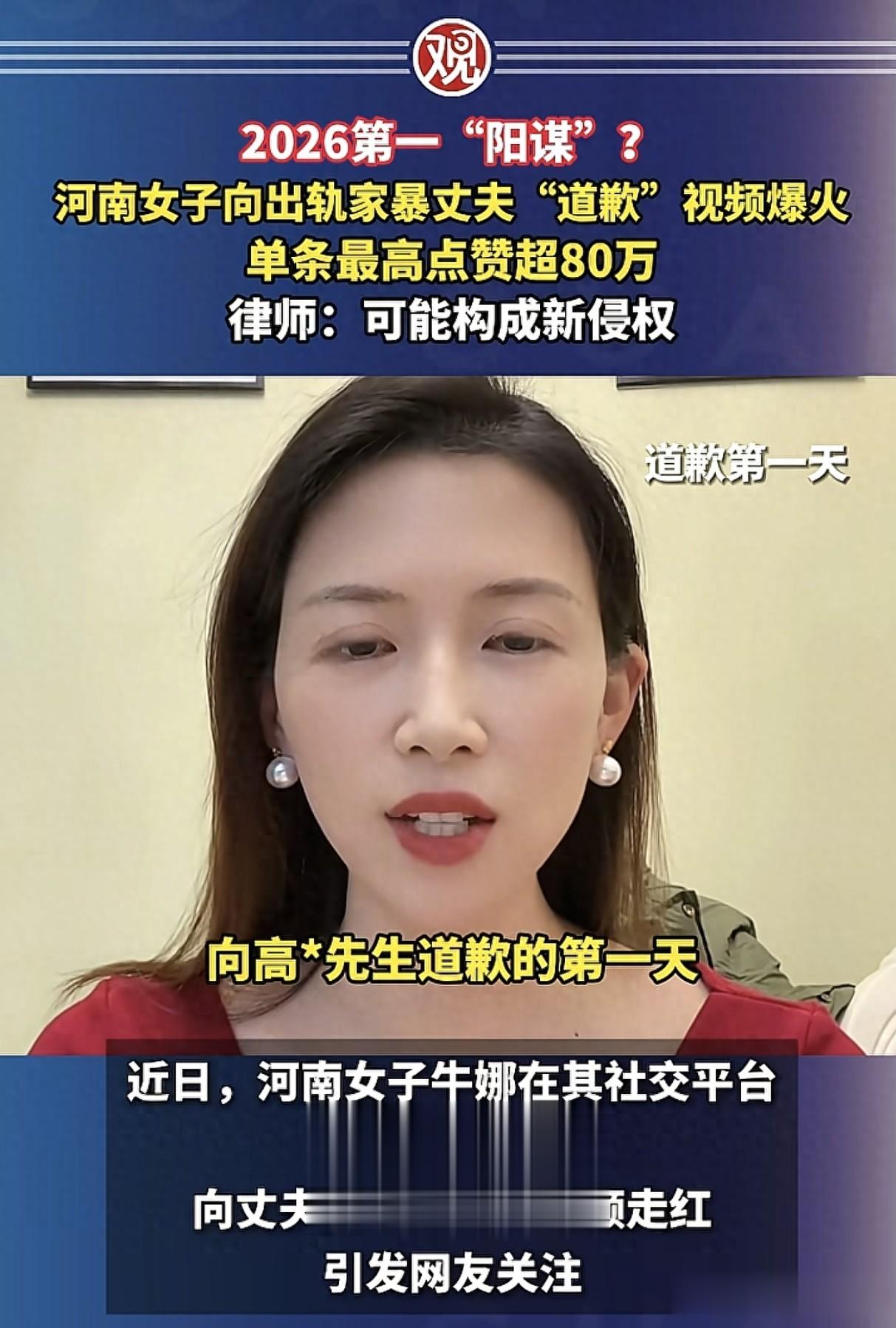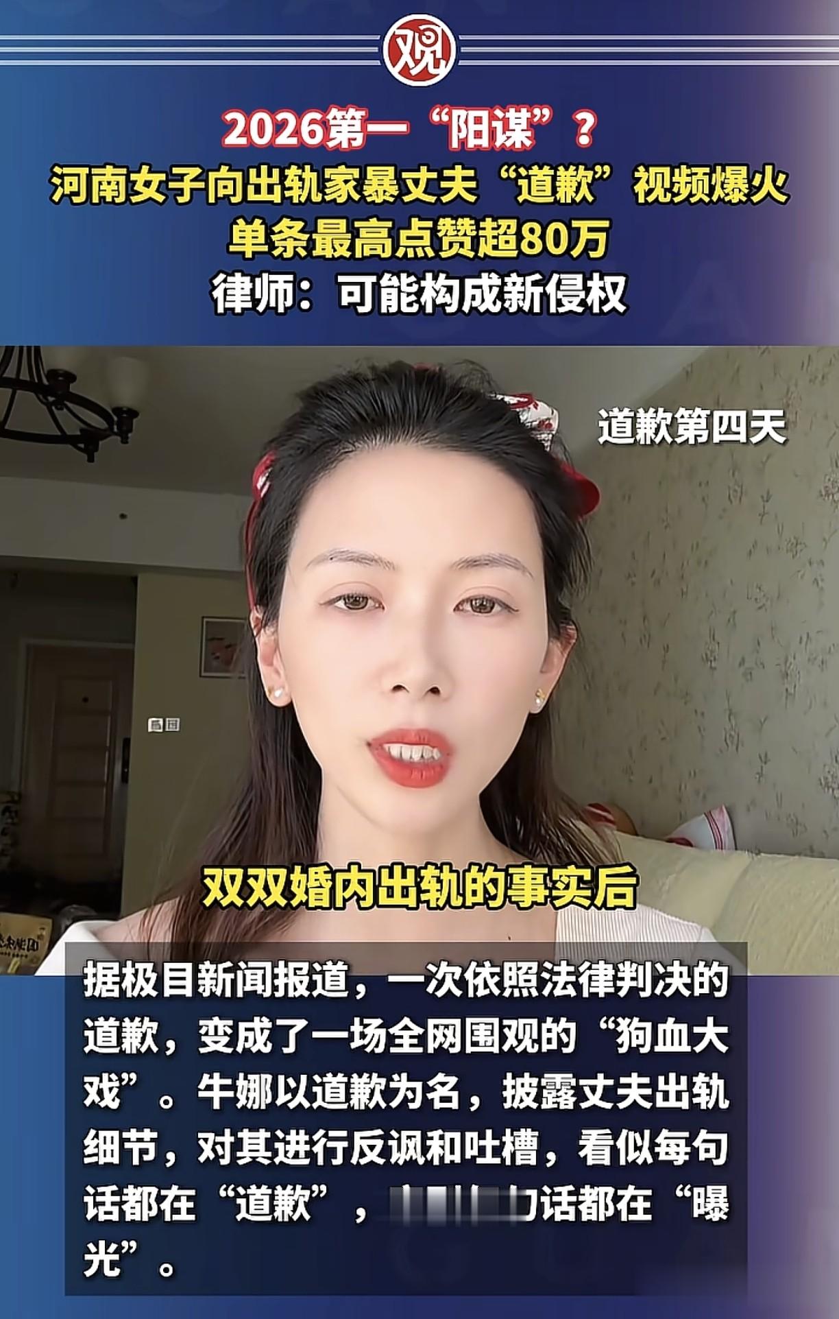 要说谁能被称为2026年第一“阳谋”,那牛娜女士无疑是其中之一,她因发现丈夫出轨举报无门,情急之下在网上发表不当言论,被她的丈夫高某及其两名律师状告,她输了,被判删除言论,公开向其丈夫道歉15天。