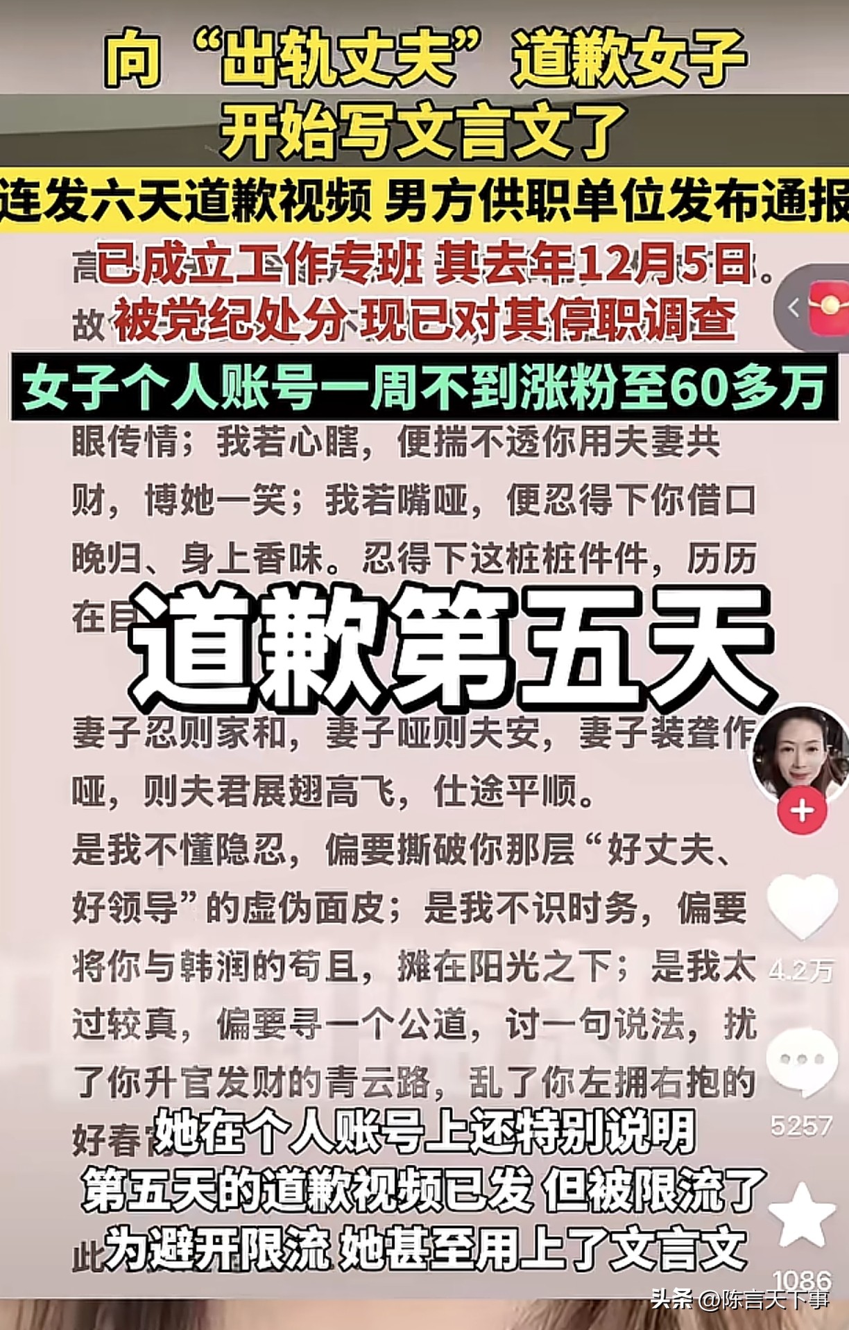 更令人意外的要从1月16日第五天道歉视频说起,这一次她改用文言文的方式呈现,直接让网友大吃一惊,没想到她还是一名才女。