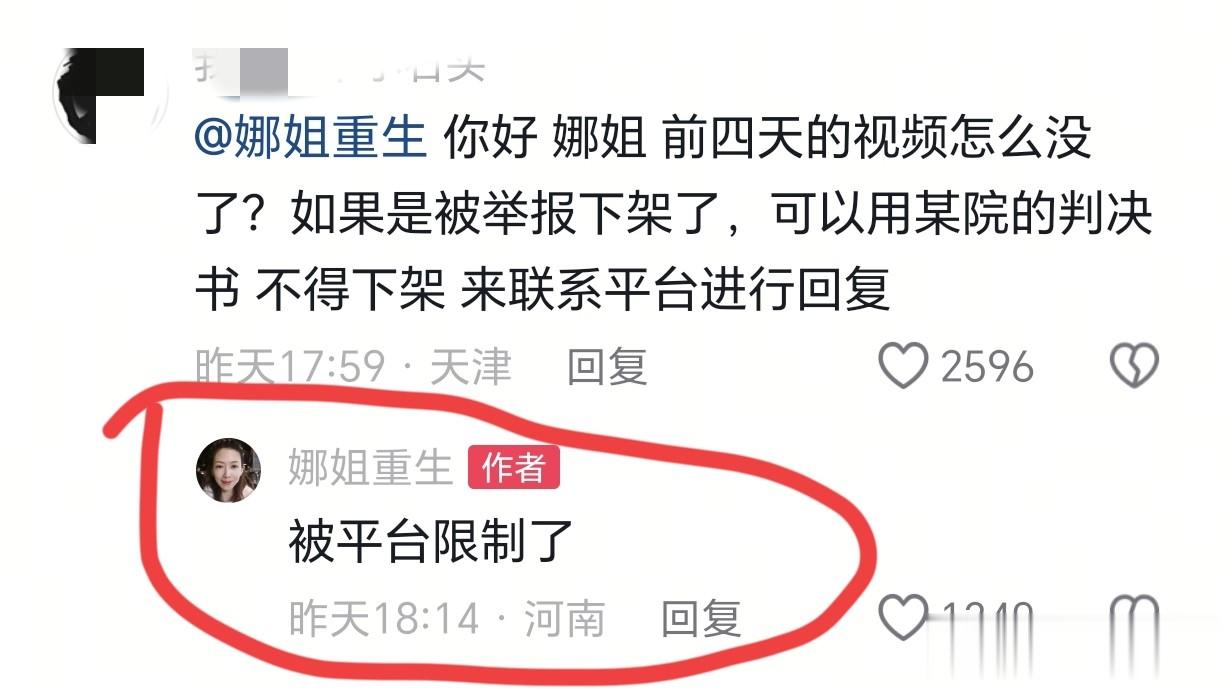 因为她前四天的道歉视频可能会再次构成新的侵权,因此这四天的视频均已被举报下架了。