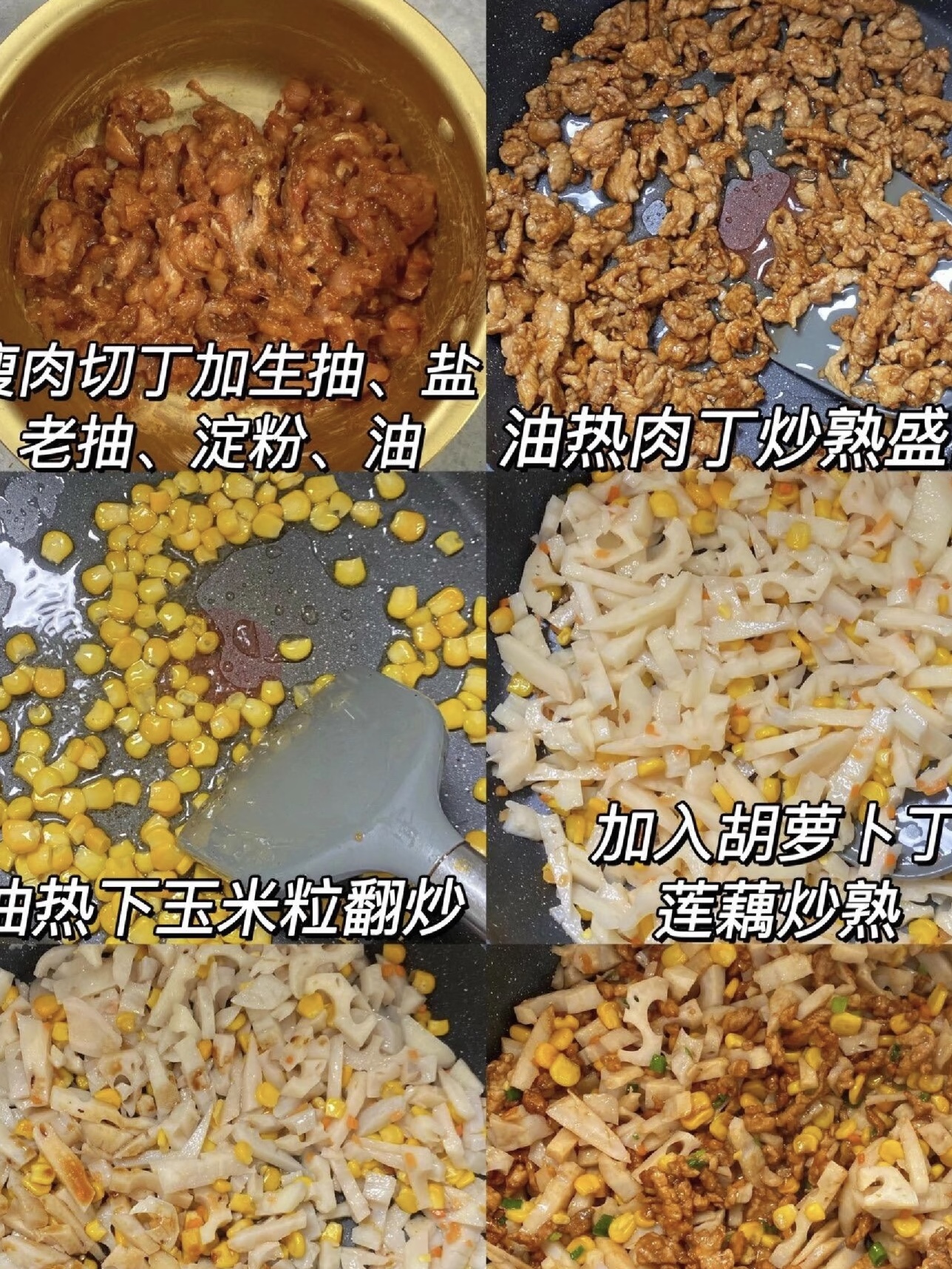 莲藕挑颜色浅粉、两头封闭的“脆藕”,手指轻轻一掰,“咔嚓”断说明够新鲜;去皮切小丁,像一颗颗“小水晶”,既易入味又保持“咔嚓”脆感。玉米用甜玉米粒,冷冻版最省事,颜色越黄越新鲜;胡萝卜切小丁,负责配色和甜味,像一颗颗“小橙宝石”。