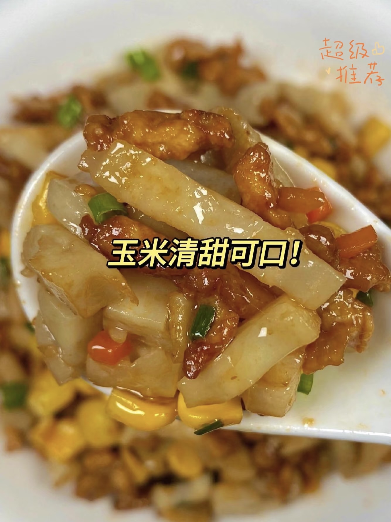 成品亮相:肉丁棕红油亮,挂着晶亮酱汁;玉米粒金黄饱满,像一颗颗“小太阳”;莲藕丁奶白透亮,点缀其间;葱花绿得晃眼,像给彩虹点了“森林星光”。先来一口肉丁——外层吸满酱香,内里嫩到像豆花,轻轻一咬,肉汁在舌尖爆开;再嚼玉米粒,“咔嚓”一声脆裂,甜味紧随,带着藕丁的清爽;配一口米饭,汤汁渗进米粒,不知不觉碗底朝天;空口吃也过瘾,鲜甜混着酱香,筷子根本停不下来。