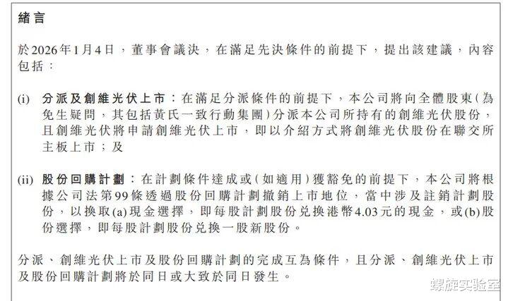 与此同时,创维集团将推进私有化退市。创维也给原股东提供了两种选择:一是按4.03港元/股的价格进行现金回购;二是“一股换一股”,将创维集团的股票换成创维光伏。