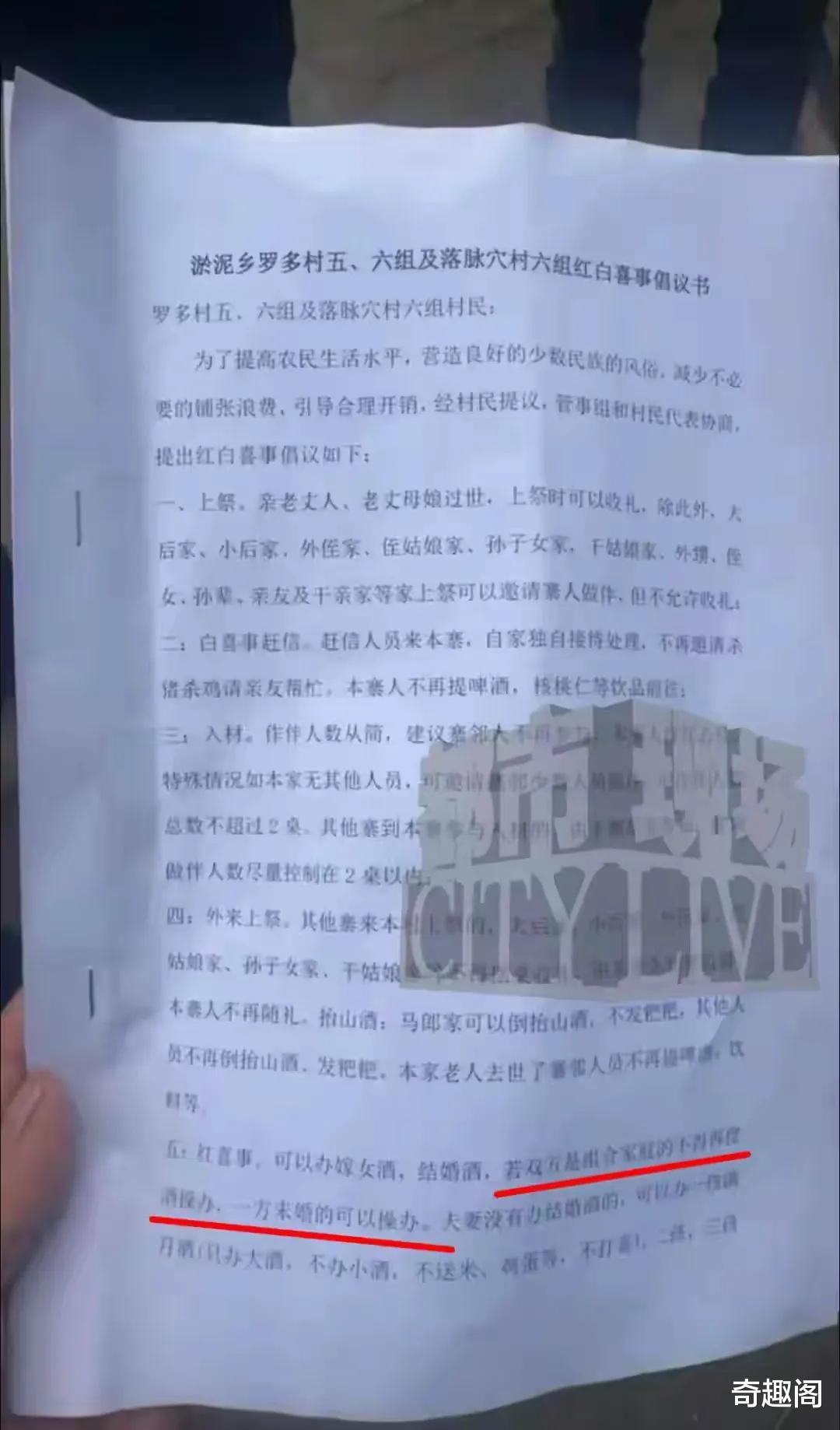 倡议书写着,如果有村民违反规定,比如强行举办违规酒席,那么全村其他人家在今后遇到红白喜事的时候,将一律不对此违规律家庭提供任何帮助。众所周知,“互帮互助”是邻里关系的基础,这样的“惩戒”,其实已经很重了。