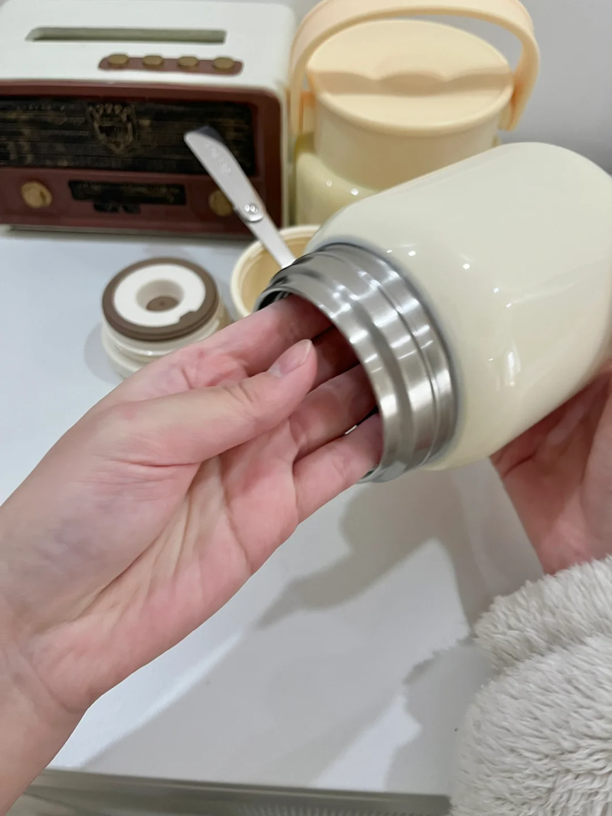 这款闷烧杯里面还自带折叠的不锈钢勺,使用的时候特别方便,杯盖也能够直接用来当碗,特别适合我们这种打工族,有需要的朋友可以考虑入手一个。