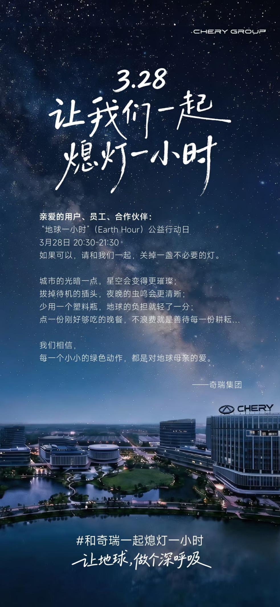 从技术筑基到产品落地,从理念倡导到全民普及,再到成果公开,奇瑞的绿色日程不是一场营销,而是一场长期战役。地球一小时不是多余环节,而是连接企业、用户与世界的关键纽带,让奇瑞的绿色转型有技术、有产品、有温度、更有全球担当。