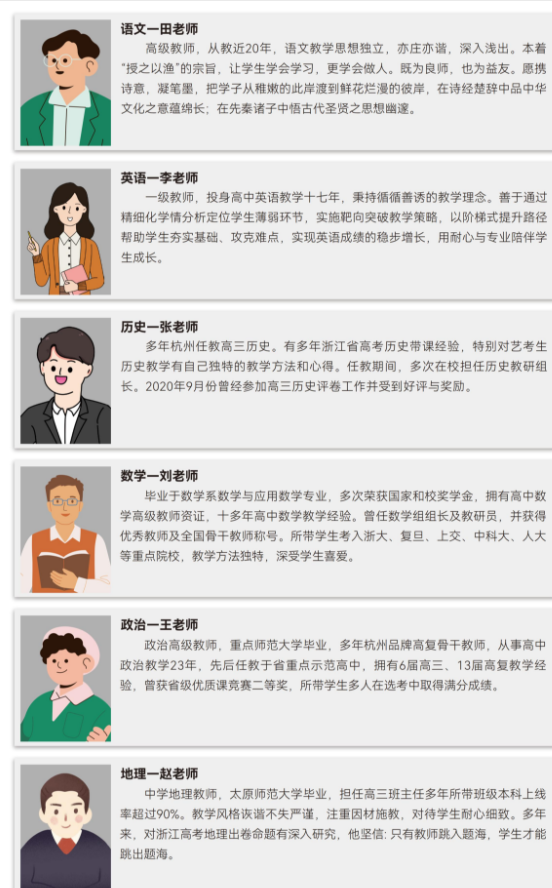教师团队由学军中学原校长领衔,人均15年高考教学经验,针对艺考生基础薄弱特点,定制“基础补弱+高频考点特训”双课程体系。例如数学学科从公式推导入手,通过真题拆解快速提分。