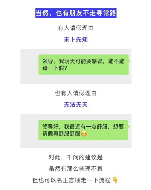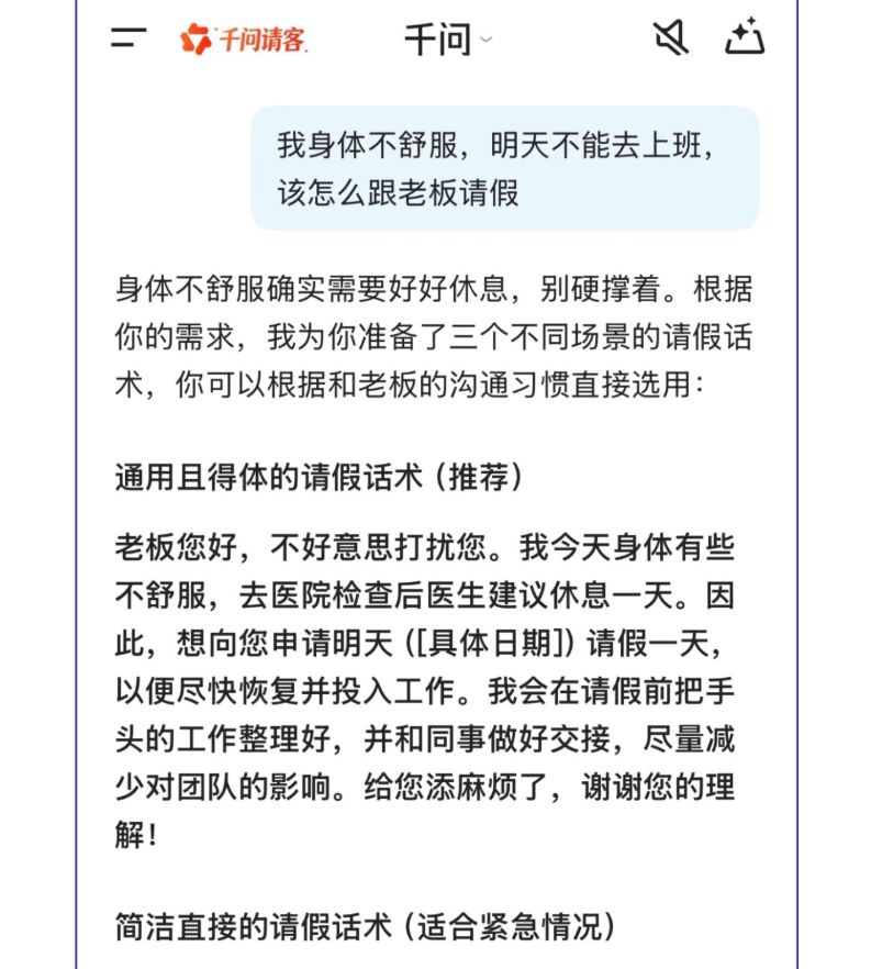 据了解,用户提出的请假理由多种多样,从“身体不适”“拔牙”“甲沟炎”等常见病因,到“明天可能要感冒”“想再舒服舒服”等幽默表达,甚至直接请求“帮我想个老板无法拒绝的请假理由”。部分用户直接输入“明天不想上班”,千问会转化为委婉话术。例如将怠工情绪包装成“房产过户”“陪审员义务”等不可抗力事件,并补充工作安排承诺,这类需求占比约20%,反映部分职场人对复工存在强烈抵触。