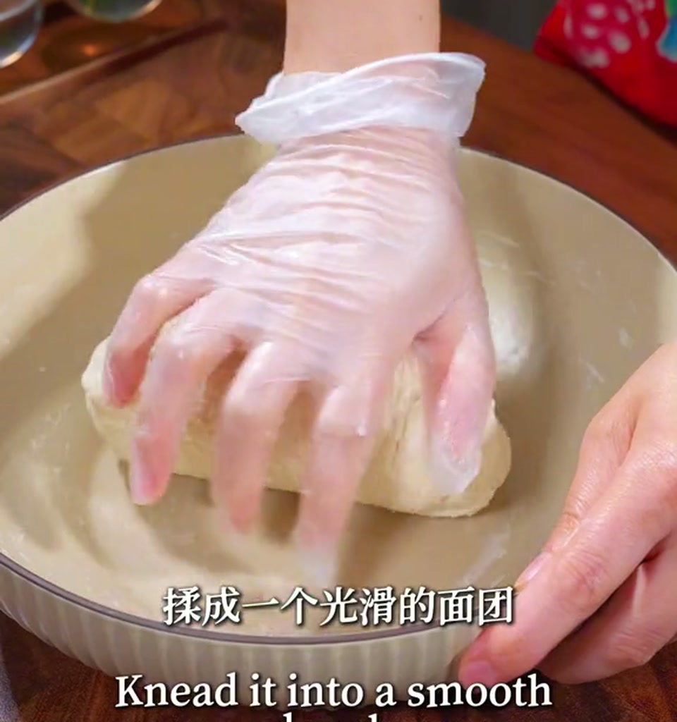 然后把梯形的两边给它对折起来,我们再用虎口收拢的方法呢,给它整理平整,揉成一个圆球。这样一个面剂子就做好了。全部做好之后呢,我们给它盖上保鲜膜,让它松弛上五分钟左右,这样一会儿好擀开。