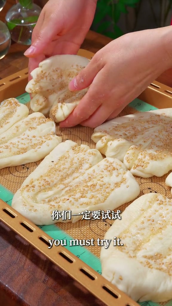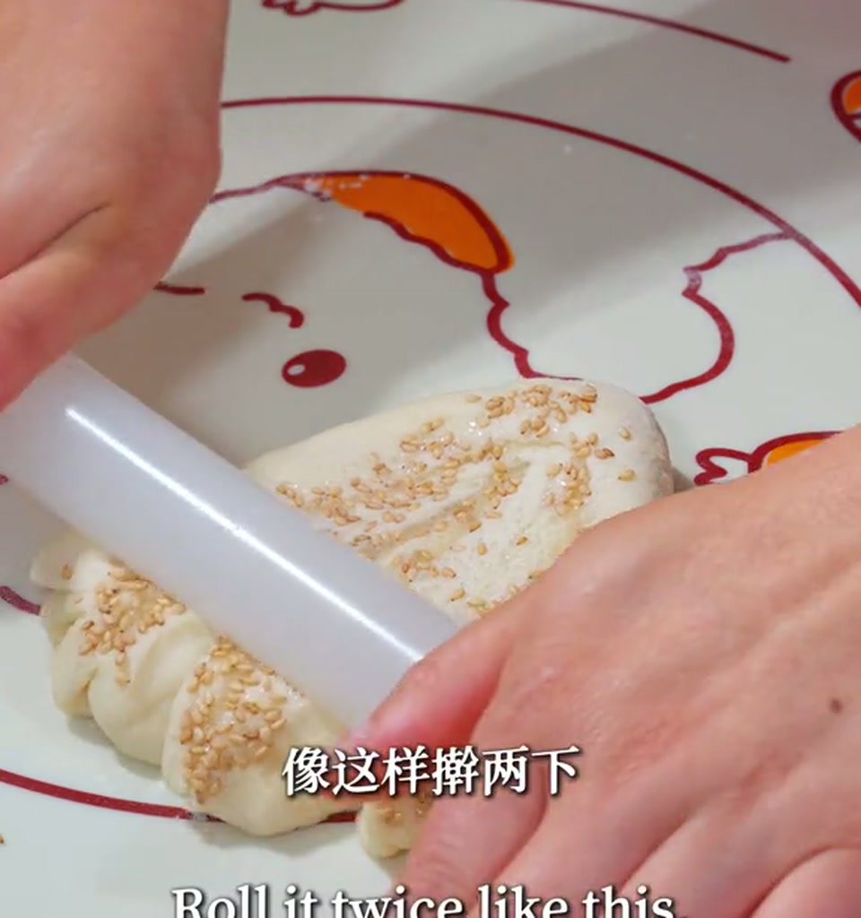 表面蘸上刚才准备好的糖芝麻,像这样轻轻擀两下,让芝麻粘得牢一点。好了,饼胚就做好了。