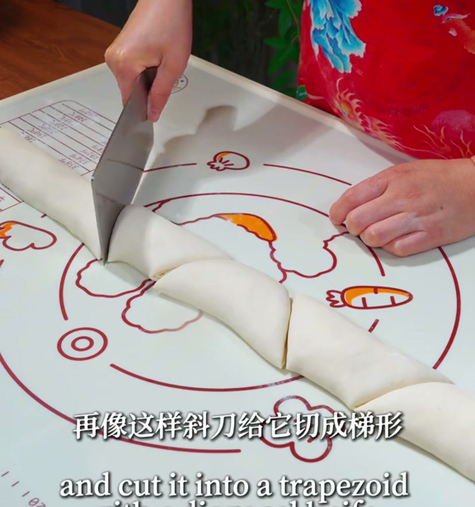 抹好之后,把它从下面往上给它卷起来,卷得稍微紧实一点。卷好后,再像这样斜刀给它切成梯形。我这里一共分了六份,你们也可以根据自家锅的大小或者烤箱大小来调整。