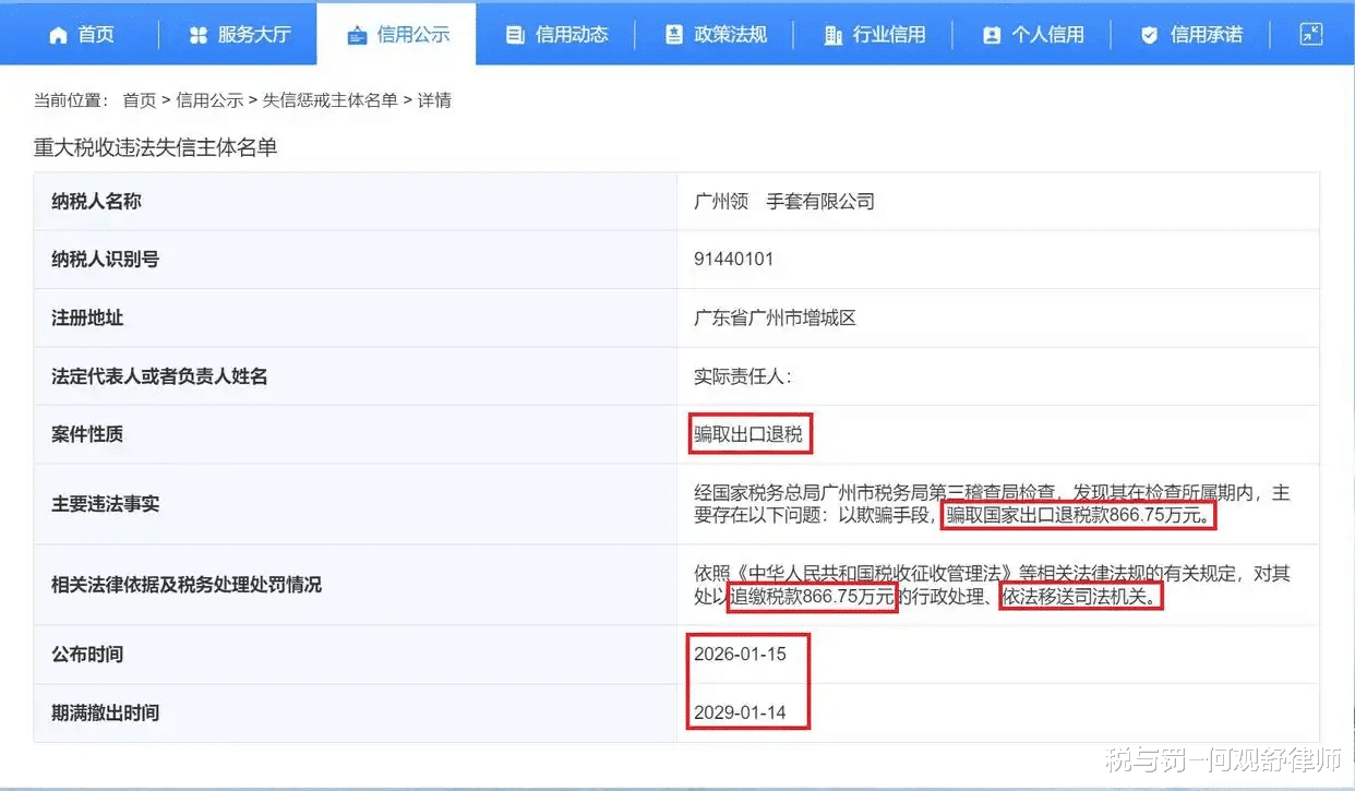 公布的信息中显示,税务部门对广州领某手套有限公司处以追缴税款866.75万元的行政处理,因涉嫌骗取出口退税罪依法移送公安机关立案侦查。