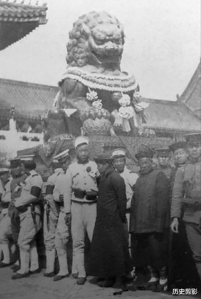 紫禁城门口的石狮子被戴上了彩花,这是皇家盛典的标配。然而,再隆重的仪式,也掩盖不了王朝末路的悲凉。
