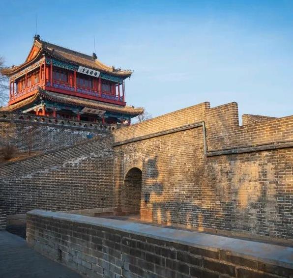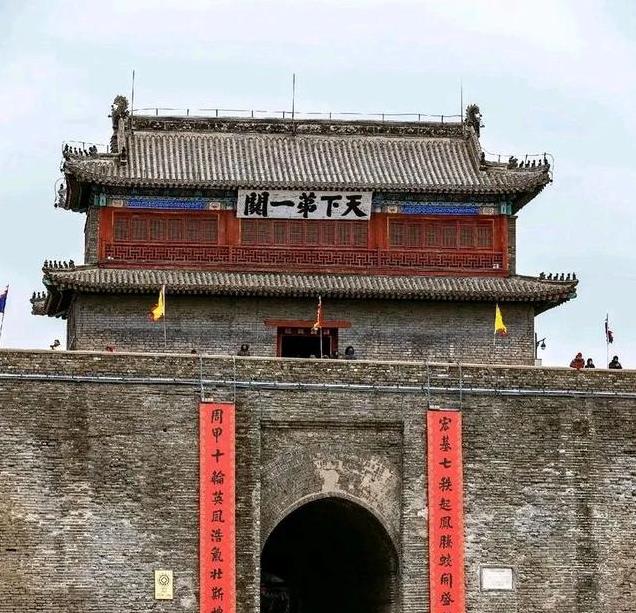 山海关东门“天下第一关”为长方形城台东西走向,高12m,下建有巨大的砖砌拱门。