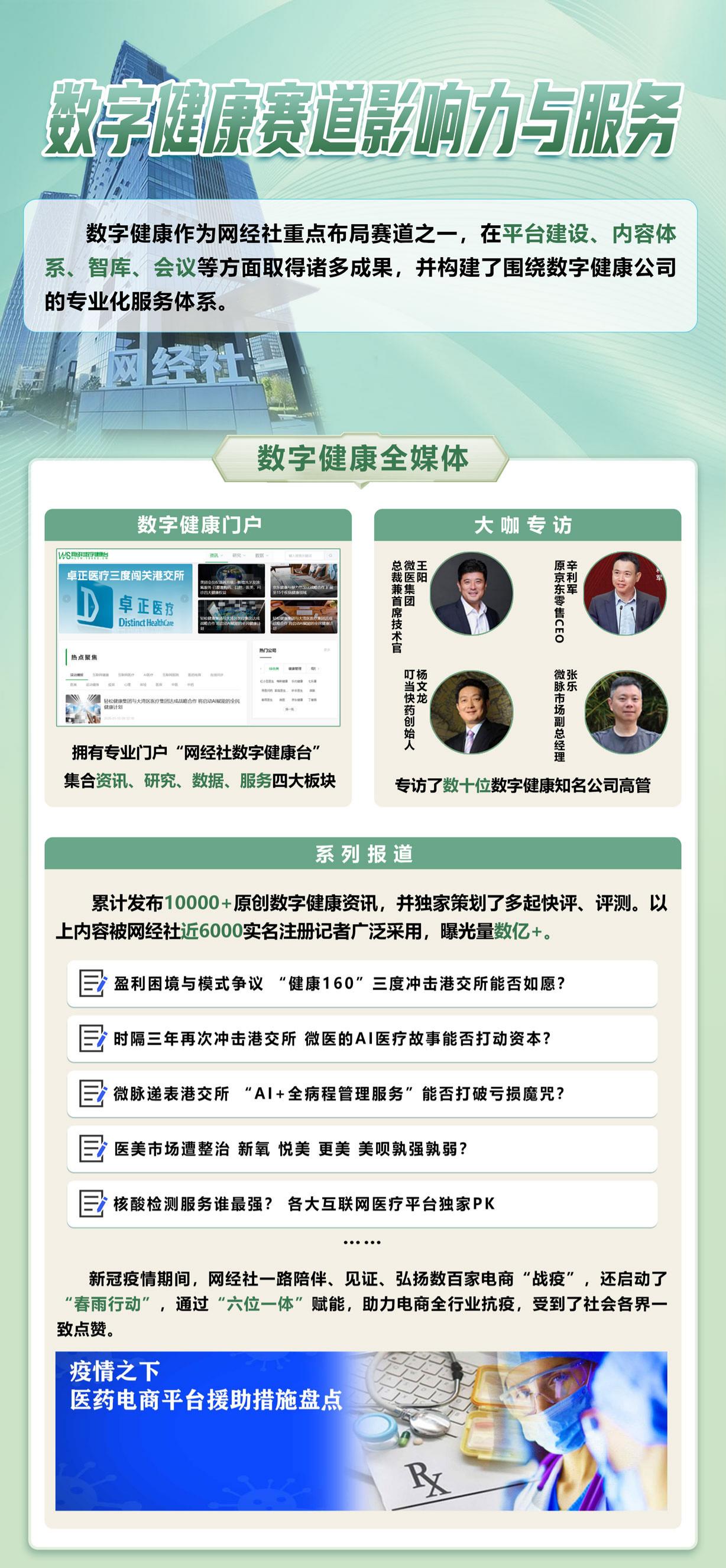 网经社深耕数字经济行业19年,长期关注数字健康,我们重点报道与研究的公司有:1.互联网医疗:京东健康、医鹿、平安健康、微脉、丁香园、微医、春雨医生、好大夫在线、爱连健康、健康160、卓正医疗、小荷健康、荷叶健康、禾连健康、智云健康、健海科技、健培科技、医日健、创业慧康、新氧、美呗等;2.医药电商:药师帮、合纵药易购、1药网、药房网、方舟健客、叮当快药、上药云健康等。