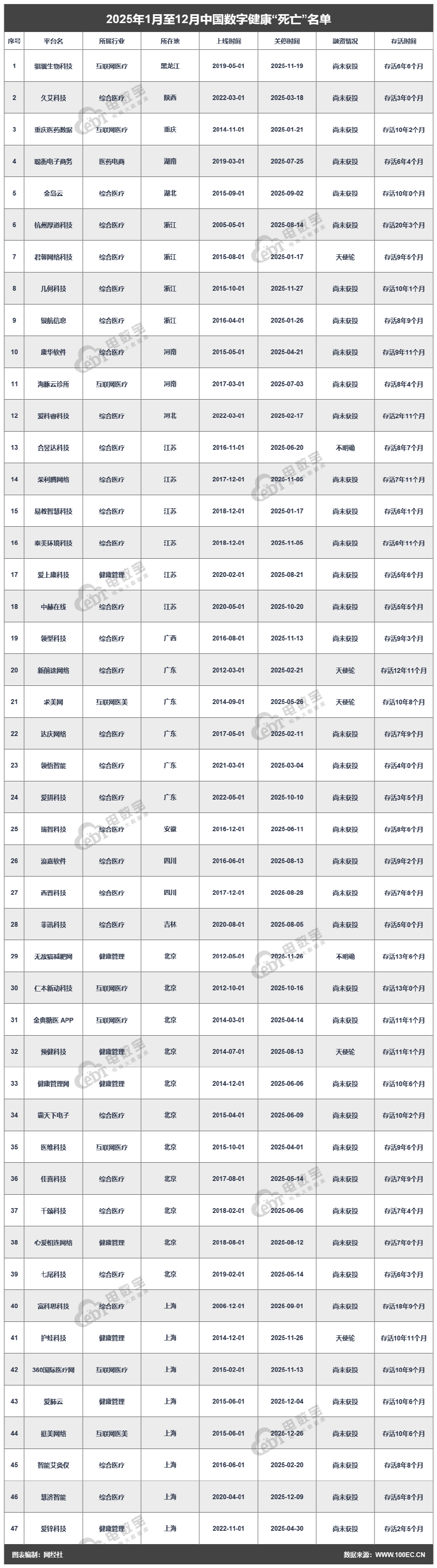 《报告》显示,2025 年数字健康 “死亡” 公司有:骐骥生物科技、久艾科技、重庆医药数据、聪衡电子商务、金岛云、杭州厚道科技、君馨网络科技、几何科技、银航信息、康华软件、海豚云诊所、爱科睿科技、合昱达科技、荣利腾网络、易教智慧科技、泰美环境科技、爱上康科技、中赫在线、领型科技、新前途网络、求美网、达庆网络、领悟智能、爱拼科技、瑞智科技、浪嘉软件、西晋科技、菲讯科技、无敌猫减肥网、仁本新动科技、金典糖医 APP、预健科技、健康管理网、霸天下电子、医维科技、佳喜科技、千颂科技、心爱相连网络、七尾科技、富科思科技、护蛙科技、360 国际医疗网、爱肺云、挺美网络、智能艾灸仪、慧济智能、爱锌科技。