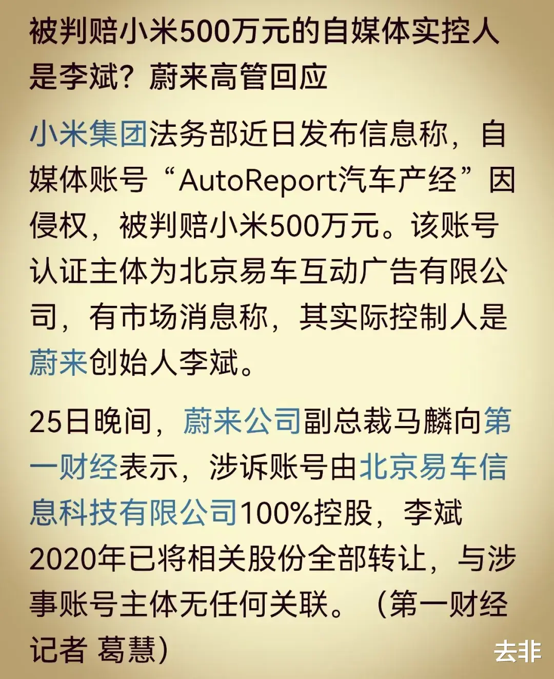 经多方信息查证,被判罚500万元的账号认证主体,为北京易车互动广告有限公司。有市场消息称,其实际控制人是蔚来创始人李斌。