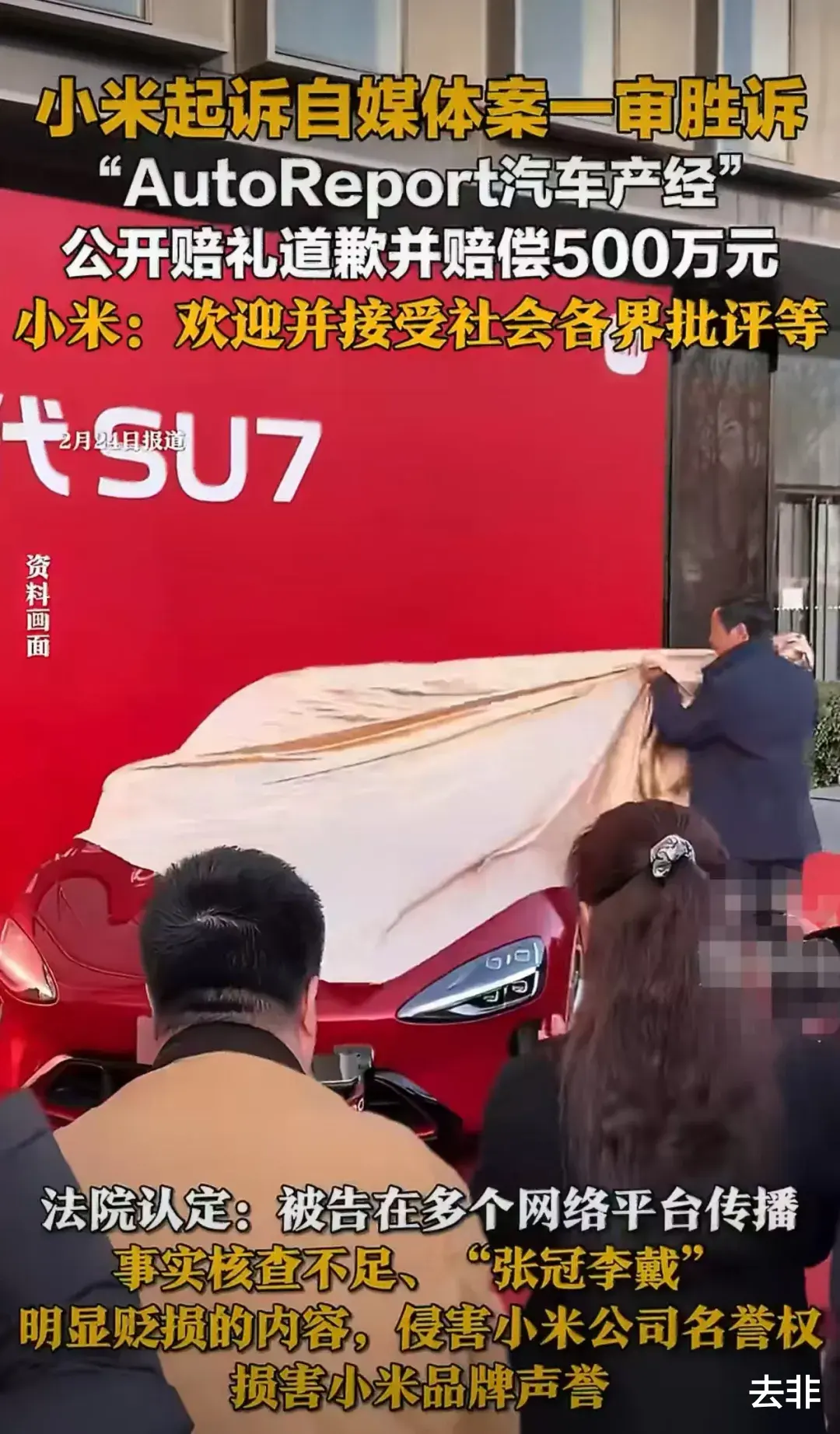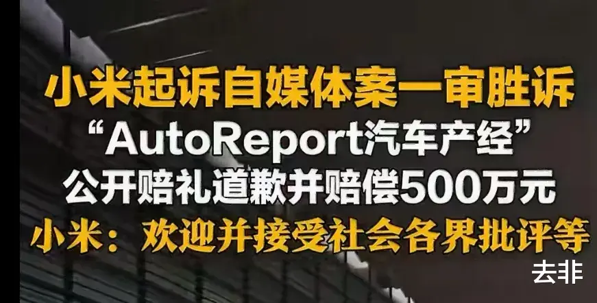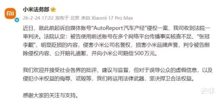 近日,小米法务部发文称,就此前起诉自媒体账号“AutoReport汽车产经”侵权一案,公司收到法院一审判决。