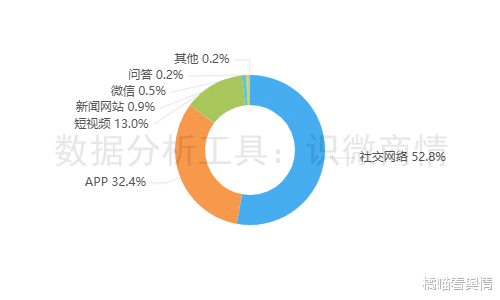 该时段内,有关“宗馥莉辞职事件”的舆情主要集中在社交网络平台,约占52.8%,其次为新闻APP(约占32.4%),短视频(约占13.0%)。