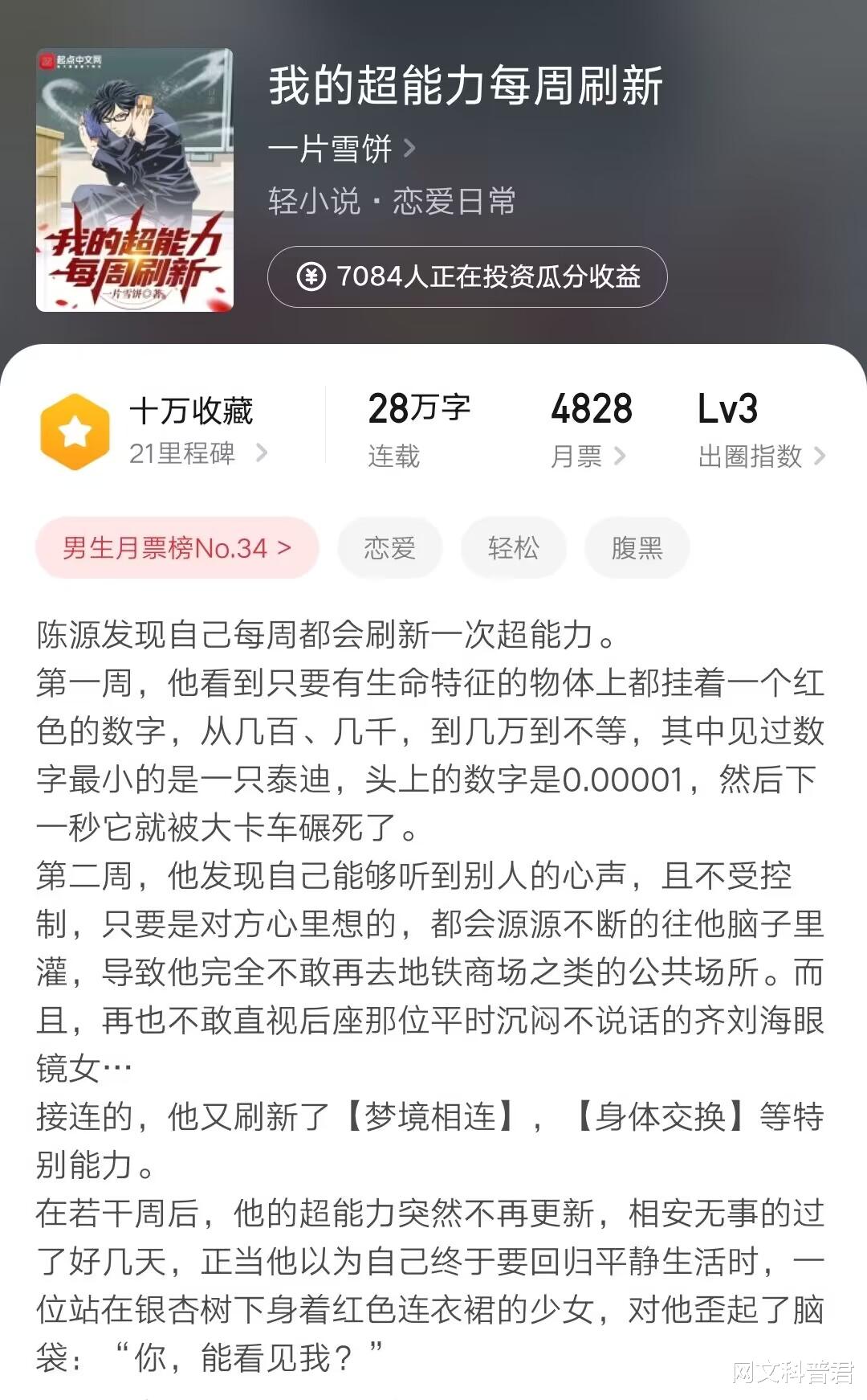第三本,《我的超能力每周更新》,首订一万出头。作者是从刺猬猫跳槽起点的,在刺猬猫的代表作有《皇叔,请匡扶汉室吧》《当工具人就能变强》,这两本书成绩都是很不错的。