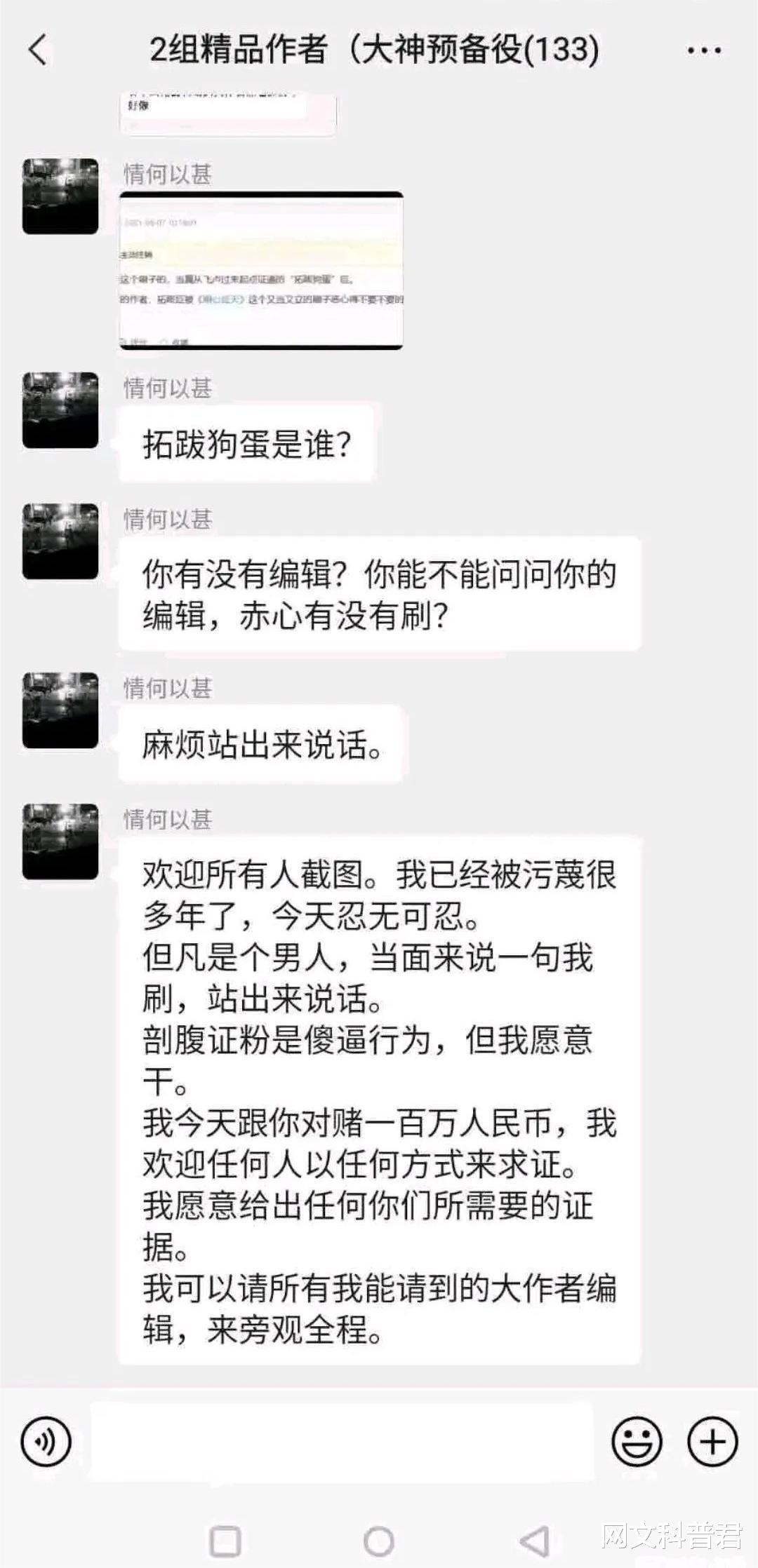 这起事件的起因也正是因为龙空一用户“小秋丫丫”发帖质疑说《赤心巡天》成绩是刷的,然后还把本周首订过万的那本《最终神职》的作者拓拔狗蛋给拉下场。不知怎么的,《赤心巡天》的作者情何以堪就看到了这个帖子,在没证实的情况下就开始破防在起点作者群里输出,扬言对赌一百万自证清白。