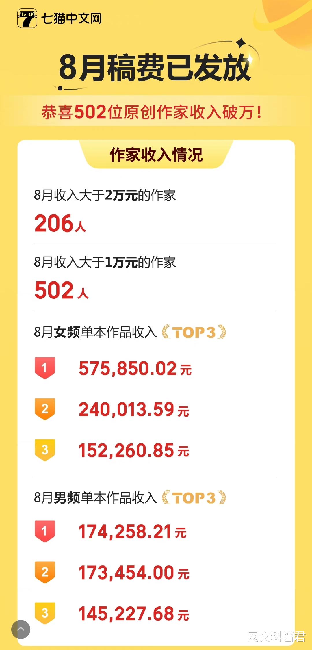 六、看了开头就想买来读的网文,小心是“换头盗文”.七、七猫8月稿费收入破万作者502位