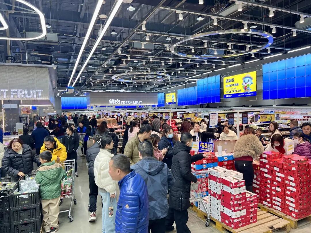 门店生鲜条码占比高达 55%,彻底填补惠山店无生鲜类目的空白,涵盖蔬菜、水果、肉禽蛋等日常高复购核心品类,从清晨鲜采的时令蔬菜到现切鲜肉、鲜活禽蛋,全方位满足家庭日常采购、三餐食材储备的核心需求,让年轻客群的 “网红打卡” 与家庭客群的“刚需消费”实现双向奔赴。