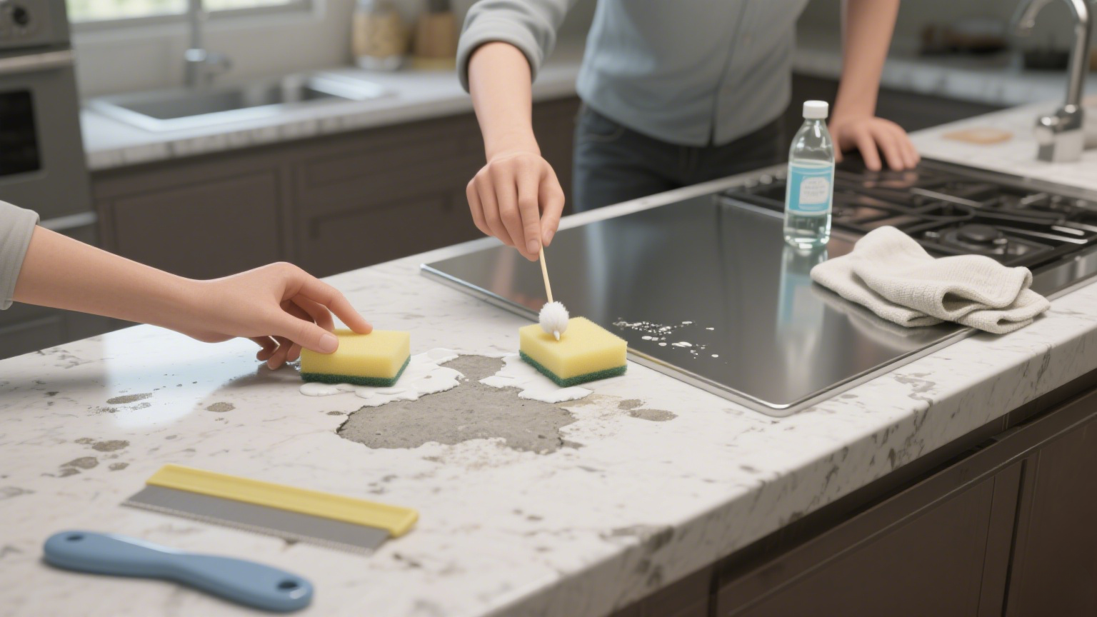 针对干透的水泥渍:石英石 / 大理石台面,用棉签蘸取石材软化剂,均匀涂抹在污渍处,静置 10 分钟,待水泥渍边缘翘起,用塑料刮板(边缘打磨光滑)轻轻刮除,力度控制在 “能推动污渍即可”;不锈钢台面,用海绵蘸取白醋水,反复擦拭污渍,白醋的酸性会分解水泥钙质,擦除后用干抹布吸干水分,避免台面留下水痕。全程禁止用钢丝球、金属铲刀,防止台面出现划痕。