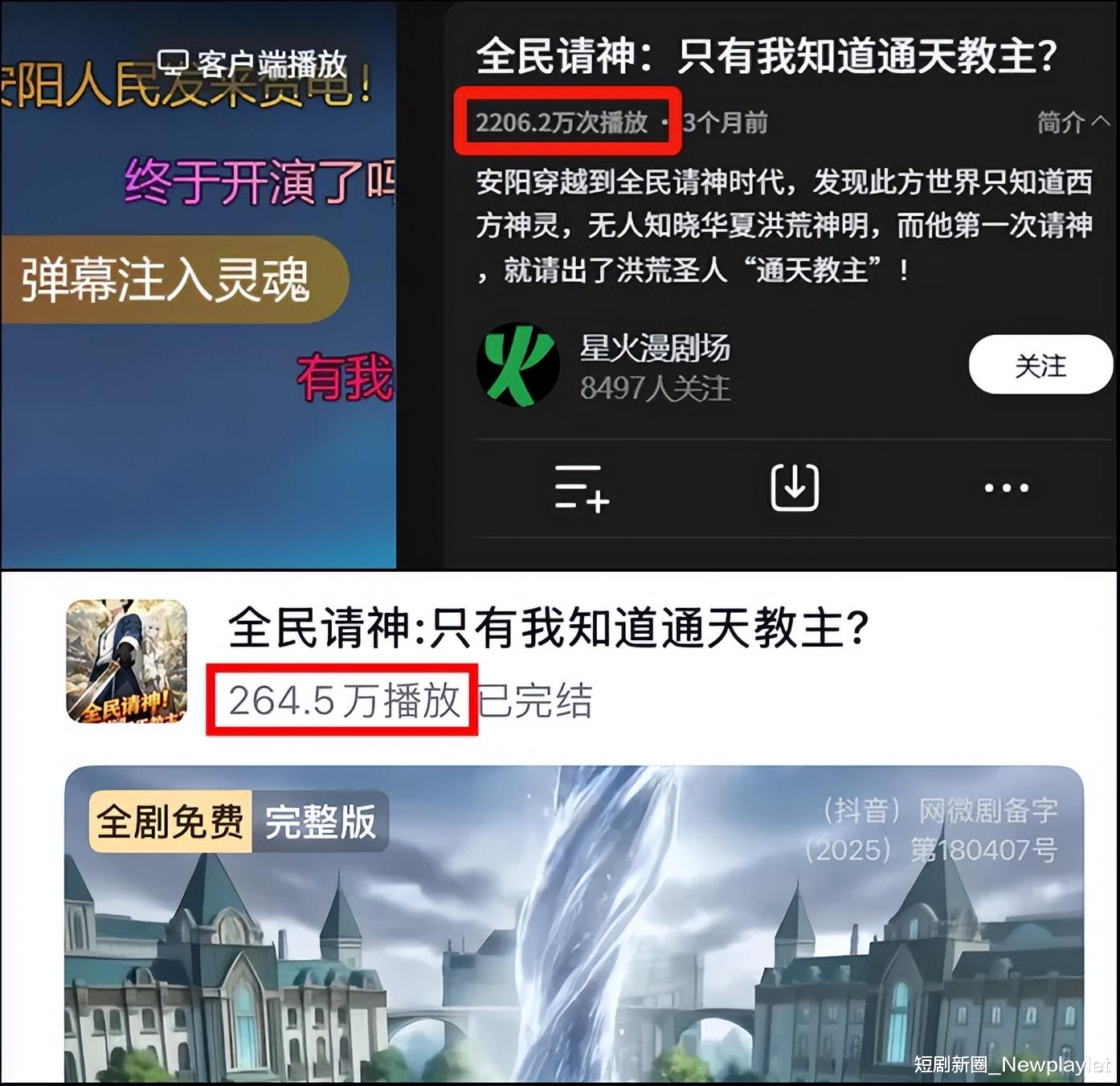 例如,AI漫剧《全民请神:只有我知道通天教主?》在腾讯视频上有着2206万的播放量(多日位居腾讯视频日飙升榜3名内),但是在抖音端的播放量仅有264.5万。这让他们明白:“我们生产的内容没有问题,只是不同的题材、不同的节奏在不同的平台,受众群体也有所不同,腾讯视频的用户对这部作品的喜爱度更高一些,所以得到的结果就会不一样”。
