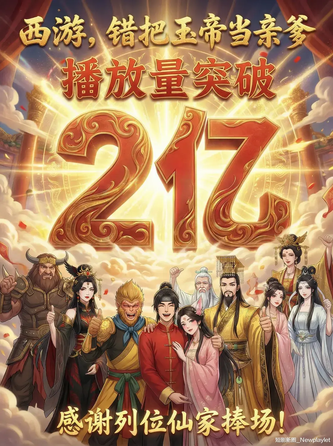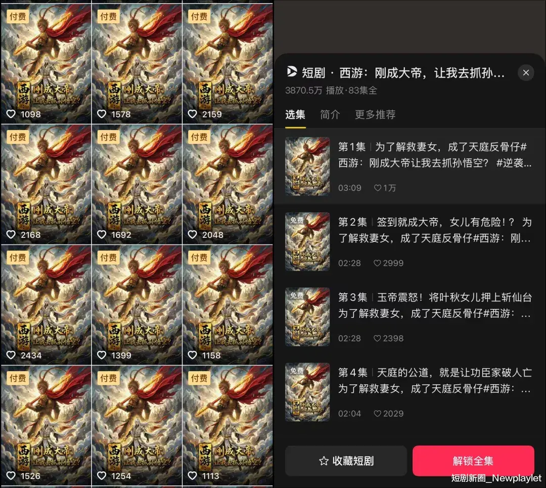 正是基于这样的思路,春节档期间,星火动漫上线了两部以经典名著《西游记》为背景的AI精品漫,另外一部是《西游:刚成大帝,让我去抓孙悟空》,该剧在抖音端的播放量超3800万,在红果短剧有着超4000万的热度。这部剧与《西游》的逻辑类似,在《西游记》的故事框架下,去讲述了一个非《西游记》原著角色的主角故事。