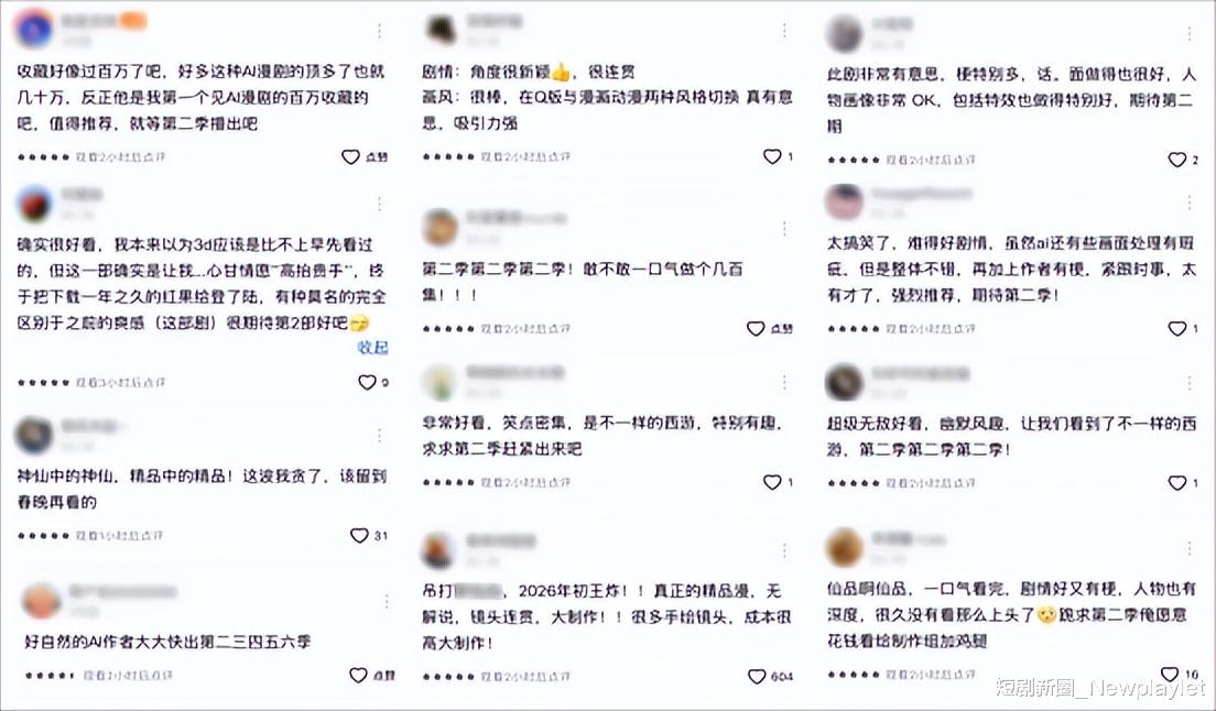 在《西游》之前,星火动漫也做出过播放量冲上8000万、9000万的热门AI短剧。但是之前的爆款剧,只有流量端的数据波动,用户层面的表现相对平静。反观《西游》,这部剧的用户平均播放集数和完播率非常高,最后一集的完播率将近30%。除此之外,《西游》在用户互动、反馈等情况,均超出了团队的预期。