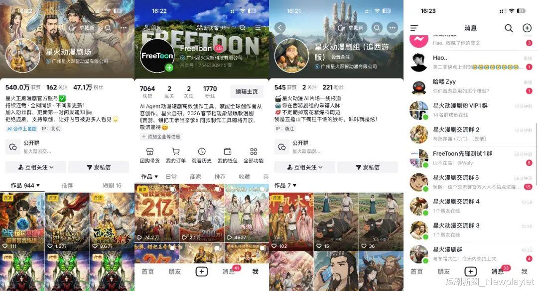 刘振华也提到,星火动漫已经完成了全平台布局。国内市场,其矩阵账号已经覆盖了抖音、红果、快手、腾讯视频、爱奇艺等主流平台,并已经同步搭建起漫剧剧场号、粉丝群、工具账号,以及像真人短剧一样的片场花絮号等,一系列账号矩阵。另一边的海外市场,则是打通了北美、日本等动漫核心市场的发行链路。