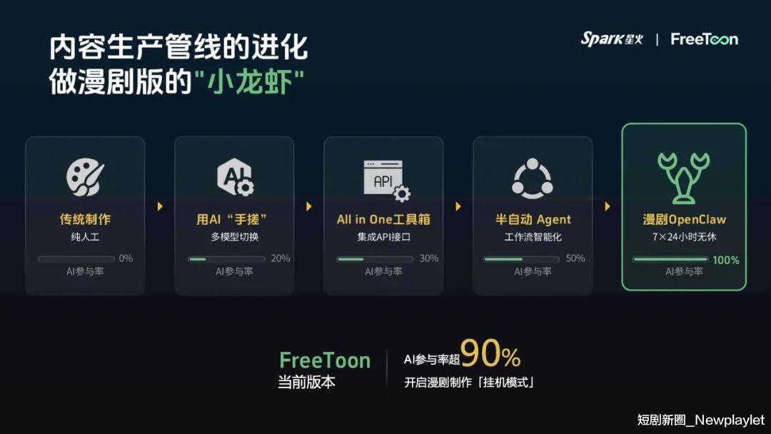 为了承接住《西游》的内容热度,短时间内实现第二季的上线,FreeToon也在保持着进化。短剧新圈(ID:Newplaylet)在跟马丁的访谈中了解到,在OpenClaw引领的“养龙虾”热潮之前,星火动漫在内部就陆续推动真人团队与AI数字员工协同作战,通过和编剧、剧本评审、导演机器人对话,来提前引导漫剧制作的“挂机时代”,即员工下班前给FreeToon布置好任务,让智能体批量挂机跑任务,次日工作时间再验收成果。