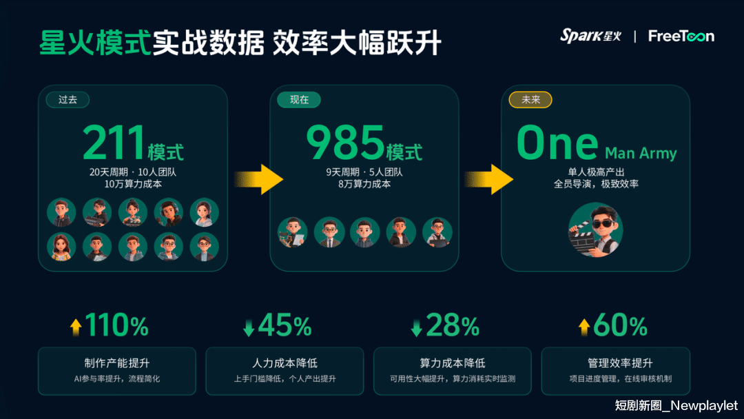 随之而来的,是星火动漫生产模式也在发生改变。春节前诞生的《西游》采用的是“211”模式,即用20天的时间、10万元的算力成本、10个人的配置,来生产出一部AI精品漫剧。但春节后,内容团队的生产模式逐步转向“985”模式,即9天的时间,8万元的算力成本,5个人的配置。