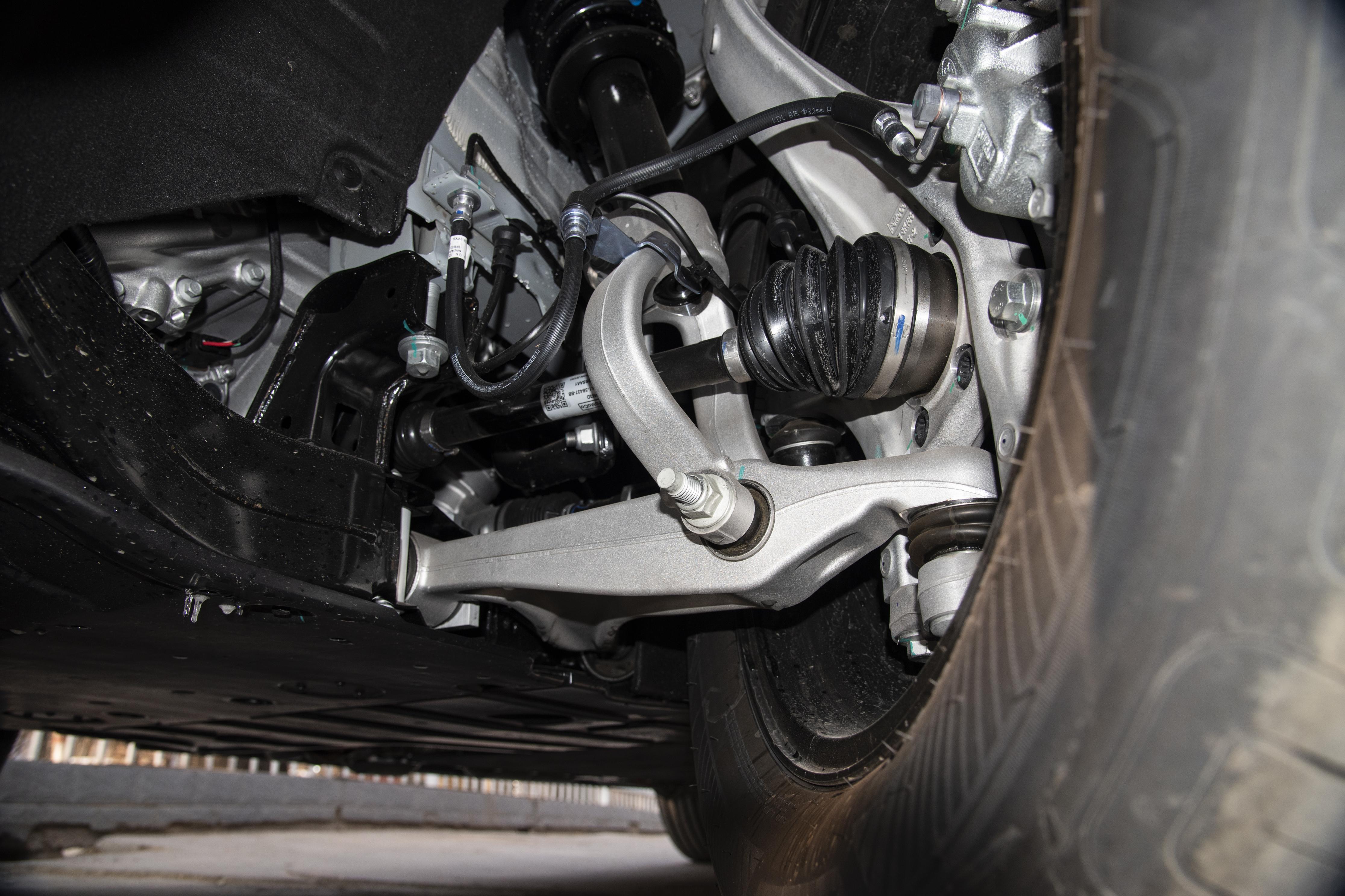 驾控:硬核越野,城市从容底盘采用铝合金前双叉臂+后五连杆独立悬架,调校偏硬朗但韧性十足,能过滤掉路面细碎震动,过减速带和坑洼时颠簸感柔和,后排乘客也不会觉得晃。城市里开完全没有硬派SUV的笨重感,5.8秒零百加速带来随叫随到的推背感,电驱的瞬时扭矩响应让起步、超车都干脆利落,方向盘转向精准沉稳,阻尼感恰到好处,高速行驶时车身稳定性极强,快速变道过弯侧倾控制出色,80km/h过弯也不晃。