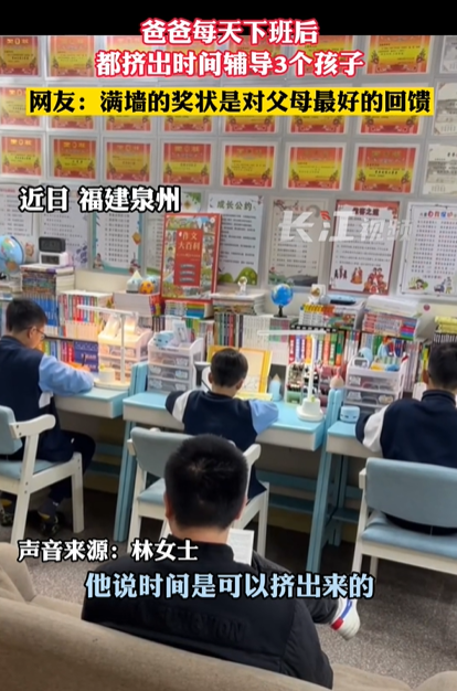 三个孩子的书房墙上贴满了奖状,爸爸静静地坐在孩子背后的沙发上陪伴他们。
