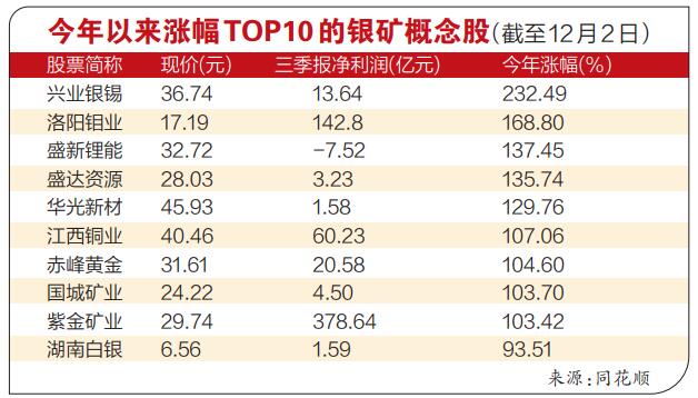 从股价来看,今年以来,A股50只银矿概念股中有过半个股涨幅超50%,9只股价涨幅超100%,包括兴业银锡、洛阳钼业和盛达资源等。其中,兴业银锡涨幅达232%居首。