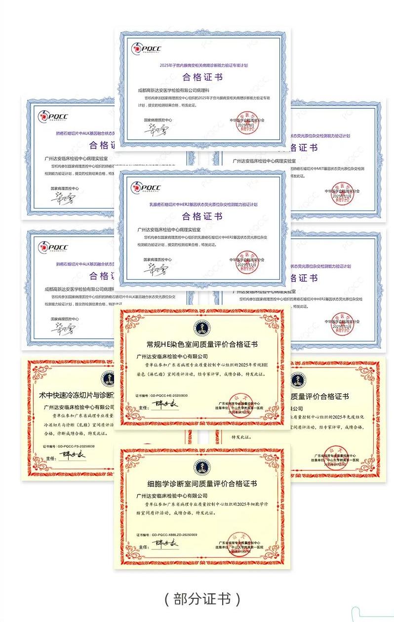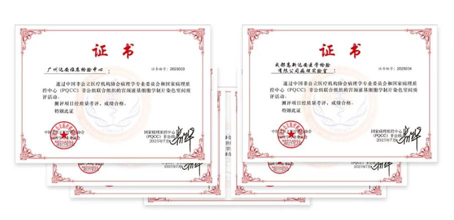 此外,两地实验室还积极参与中国非公立医疗机构协会与PQCC非公组联合组织的室间质评活动,在常规HE染色、液基细胞、特殊染色等基础项目中均以优异成绩通过,全方位展现了从基础检测到前沿技术的全链条专业把控能力。