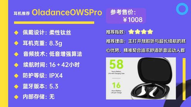 OladanceOWSPro凭借不入耳开放结构,主打开放式聆听与超长续航,适合追求舒适佩戴、重视续航表现的运动人群。