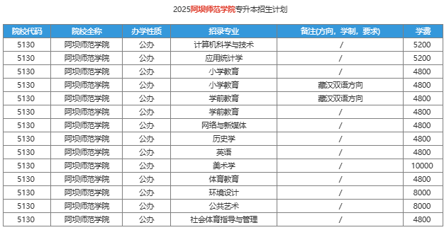 2025阿坝师范学院专升本招生专业涵盖计算机科学与技术、应用统计学、小学教育(含藏汉双语方向)、学前教育(含藏汉双语方向)、网络与新媒体、历史学、英语、美术学、体育教育、环境设计、公共艺术、社会体育指导与管理。具体招生专业如下: