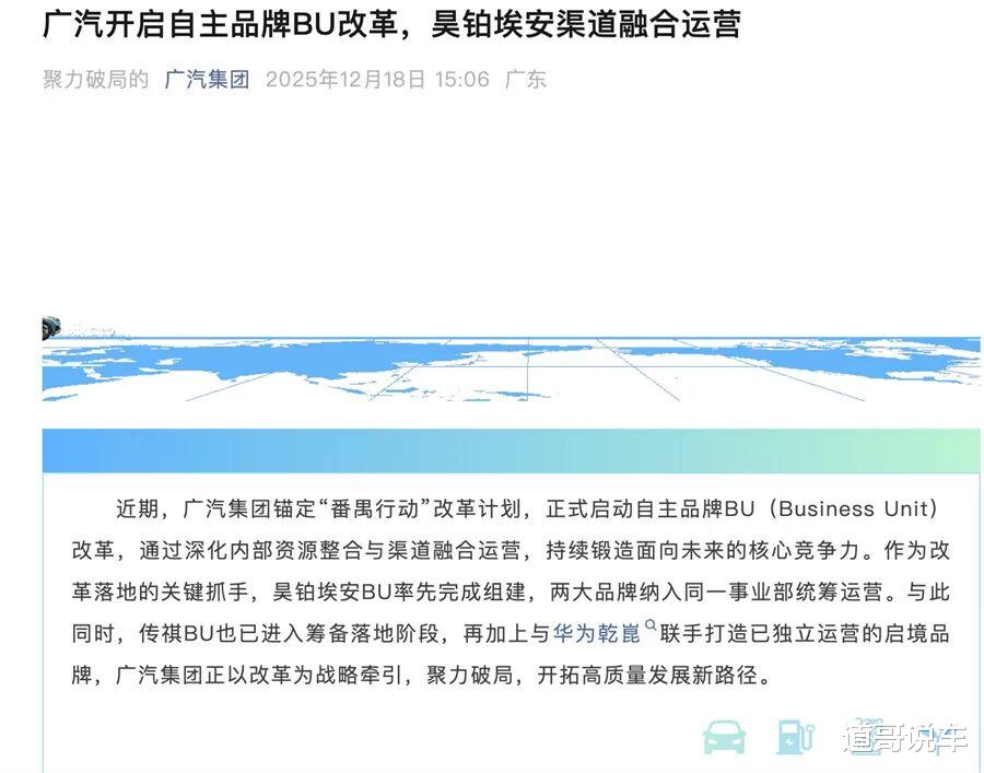 【文/财圈社&道哥说车 麻建宇】12月18日,广汽集团官方公众号消息称,将正式启动自主品牌BU改革,昊铂埃安BU率先完成组建,两大品牌纳入同一事业部统筹运营,并将在2026年3月底前完成渠道全面融合。