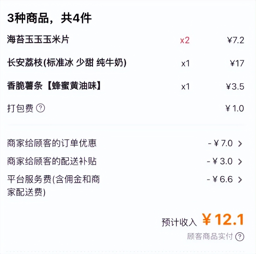 所以,综合算下来,商家在外卖平台上的实际综合扣点,远不是官方公示的6%-8%。这个差距,就藏在平台们的计算方式,平台抽成不管你优惠多少,外卖配送费用原价,他只算你的原价,就以上面这一单为例,外卖平台的收入超过奶茶店收入50%以上,所以平台旱涝保收,外卖商家就得想方设法去应对利润大幅被消减的成本问题。