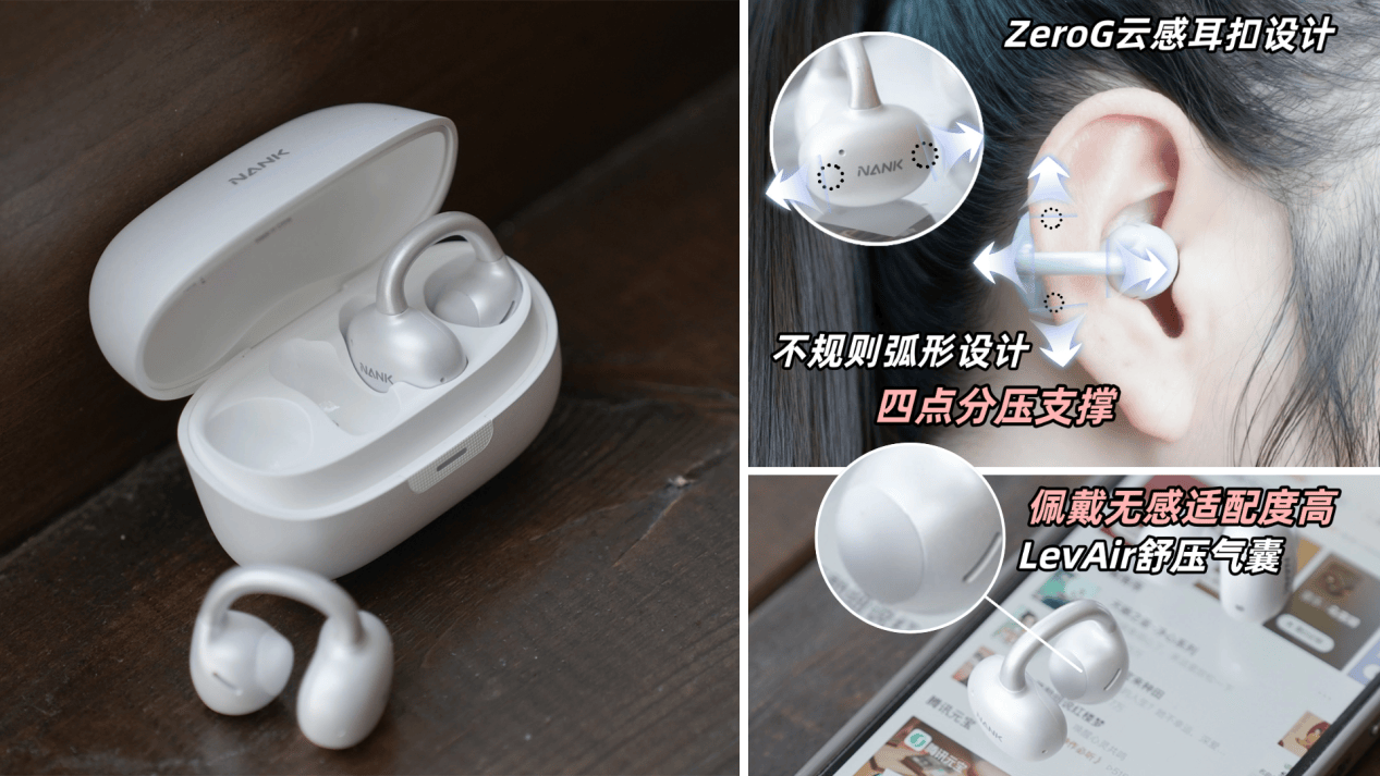 佩戴上,南卡ClipSuper2也是卷到了极致,耳夹采用了全新ZeroG云感耳扣设计,配合LevAir零压气囊,完成了耳机舒适的终极进化。佩戴时固定单元的零压气囊,通过微气压缓冲,和四点分压支撑点,且它的单耳重量仅4.8g,长时间佩戴也没有压迫感,真正实现了“零压悬浮”贴合,哪怕是佩戴一整天,跑步出汗,也能稳稳不掉!耳夹连接桥采用的是航空钛合金家高分子记忆材料,柔韧结实,弯折上万次也不变形!总的来说,南卡ClipSuper2把佩戴体验做到极致,稳、轻、无感,百元价位无对手!