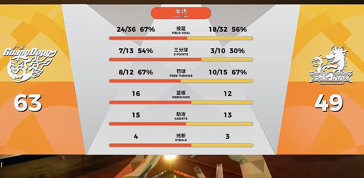 后半节家政重新回归,奎因抢断助攻徐杰上篮,张皓嘉2罚全丢但也造了亨特贾尔斯2个失误,在嘉哥“强大的内线防守震慑下”(其实萨林杰才是真正关键),江苏出现了得分断电,节末奎因再度接管比赛,里突外投率队再打出一波17-11,广东单节打了江苏一个35-17,半场9人轮换以63-49领先江苏。